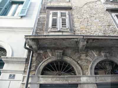 FACCIATA SU VIA BECCHERIE Basamento in pietra bianca bocciardata, rivestimento della fascia al piano terra in pietra bianca bulinata in corrispondenza del locale commerciale. Fori al piano terra con cornici arcuate in pietra bianca bulinata, decorate da chiavi di volta con volute in pietra. Architrave orizzontale sviluppato su tutta la lunghezza di facciata. Al centro un'iscrizione parzialmente leggibile (forse "MACELLERIA"). Sopraluce protetti da inferriate in ferro battuto. In corrispondenza del sopraluce del foro centrale, una lanternina in ferro battuto ed un'iscrizione recante la data 1851 (Pict0001.jpg). Banchina su mensole squadrate in pietra bianca a livello del primo orizzontamento, a protezione dell'ingresso al locale commerciale. Superficie di facciata trattata ad intonaco con marcapiano intonacato in corrispondenza del solaio del terzo piano. Serramenti oscuranti esterni in legno uso Trieste, montati su cornici in pietra bianca bulinata, con architrave a mensola al primo piano, architrave semplice ai piani superiori. Gronda e pluviale in lamiera. FACCIATA SU ANDRONA DEL PANE: Facciata trattata ad intonaco su tutta l'altezza. Fori architettonici con cornici semplici in pietra bianca bulinata. Porta di ingresso al piano terra in legno massello verniciato. Serramenti esterni dei piani superiori in legno senza oscuranti, ad otto specchiature con apertura a ghigliottina. INTERNO Scala con pianerottoli e gradini in lastre di pietra bianca bulinata e corrimano in ferro. Serramenti interni lignei e pavimenti in doghe di legno.