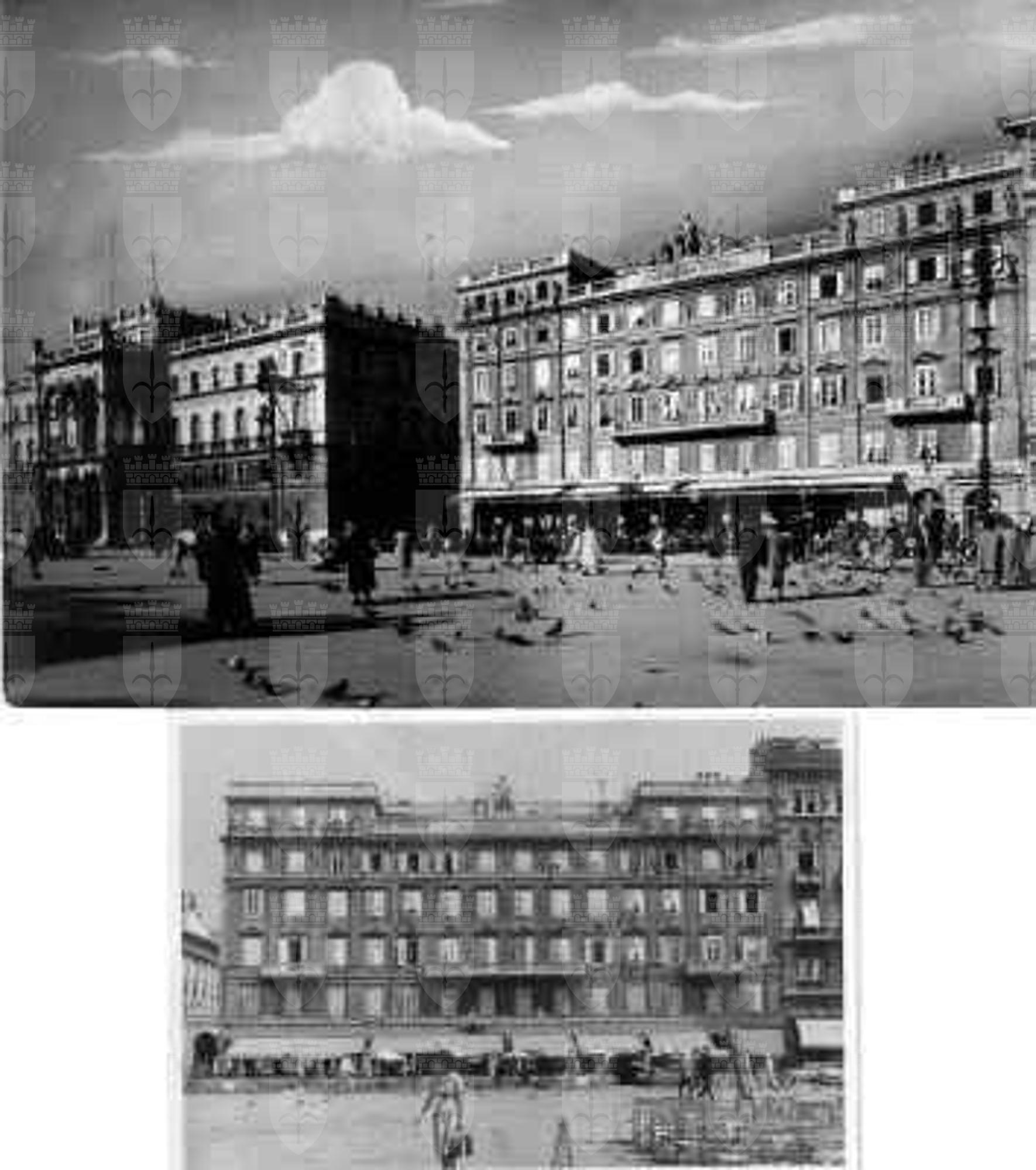 A partire dal 1815 circa il commerciante greco Nicolò Stratti acquistò e demolì vari edifici e case private sull'area già occupata dal macello, dalle beccherie e, successivamente, da alcune abitazioni civili e dalla Scuderia civica, per farsi edificare un grande palazzo. Anticamente su quella stessa area sorgevano il molo medievale del Mandracchio e il castello Amarina, fortezza veneziana eretta nel 1375, e distrutta pochi anni dopo. Palazzo Stratti fu costruito su progetto di Antonio Buttazzoni nel 1839, ma l'odierno aspetto dell'edificio non corrisponde esattamente al progetto originario di questo architetto, perché fu sottoposto a diverse modifiche negli anni successivi. Buttazzoni aveva considerato quale facciata principale del palazzo quella che si affaccia su Passo di Piazza e non quella su Piazza dell'Unità, perché all'epoca l'assetto della piazza era molto diverso rispetto ad oggi. Nel 1846 lo stabile fu acquistato dalle Assicurazioni Generali, che collocarono sulla sommità della facciata un gruppo scultoreo ornamentale e la loro insegna. Al 1866 risalgono le prime modifiche ad opera di Antonio Seu, ma l'attuale aspetto delle facciate è da ricondurre alle trasformazioni apportate da Eugenio Geiringer e Giovanni Righetti tra il 1865 e il 1872, conferendo un nuovo volto eclettico all'intero palazzo. Nel 1972 il restauro di palazzo Stratti fu curato dall'architetto Lucio Arnesi e dall'ingegnere Paolo Scarpa, rispettando la struttura originaria dello stesso. Dal 1839 l'edificio ospita il Caffè degli Specchi.