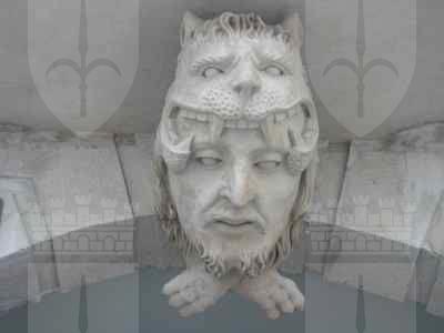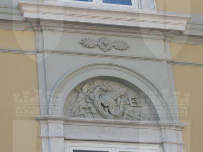 PANDURO (esterno) Il panduro collocato in chiave d'arco della Portizza raffigura un Ercole incappucciato da una testa di leone, con le zampe incrociate sotto al mento BASSORILIEVI (esterno) Un fregio a bassorilievo con motivi vegetali e allegorici corona la parte superiore del tetto. Le Lunette delle finestre del primo piano sono decorate con dei motivi allegorici a bassorilievo.