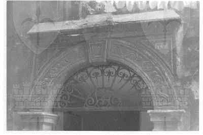 ELEMENTI ORNAMENTALI (esterno) Il portale ad arco presenta decorazioni a rilevo con motivi vegetali e floreali. In chiave d'arco è scolpita una rosellina. Sui pilastri che sostengono l'arco sono raffigurati motivi a scudo araldico e fiori.