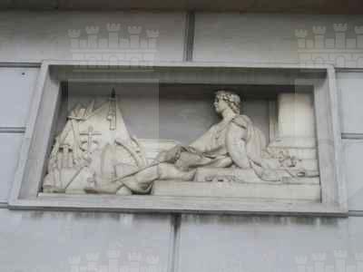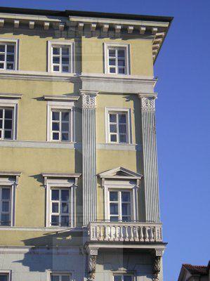 BALAUSTRA (esterno): Balcone con parapetto a balaustre ad anfora in corrispondenza delle parti aggettanti del primo piano. PARASTE (esterno): Paraste scanalate di ordine tuscanico tra primo e secondo piano in corrispondenza delle parti aggettanti. RILIEVI (esterno): Tondi decorativi raffiguranti le parti del mondo, opera di Pietro Zandomeneghi. Rettangoli scolpiti a bassorilievo da Giuseppe Moscotto e Giovanni Depaul rappresentano l'Onore, l'Industria, la Navigazione, la Riflessione, la Religione, la Costanza, la Beneficenza e il Commercio. I rilievi sono collocati negli spazi tra i fori architettonici del pianoterra.