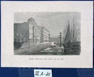 L'edificio venne realizzato nel 1839 su progetto dell'architetto Giovanni Degasperi, sul sito in cui sorgeva l'antica Cappella Rossetti. In origine intitolato al principe Metternich, assunse il nome di Hôtel de la Ville solo nel 1871. L'albergo, inaugurato il 1° giugno del 1841, ospitò personaggi importanti, come conti, ambasciatori, artisti, tra cui Giuseppe Verdi nel 1850, il re Ottone di Grecia nel 1858, fino a Gabrile D'Annunzio nel 1902. L'albergo era dotato anche di bagni pubblici, di acqua dolce, del Grande Ristorante con vista sul mare e del Cafè Divan, aperto nel 1839. Al 1860 risalgono i rettangoli scolpiti a bassorilievo sul pianterreno rappresentanti una decina di figure allegoriche, opera degli scultori Giuseppe Moscotto e Giovanni Depaul. Tale decorazione voluta dal mecenate Pasquale Revoltella si affiancava alla serie di tondi a rilievo dello scultore Pietro Zadomeneghi. Nel 1888 vennero apportate delle modifiche al pianoterra. Lavori di ristrutturazione generale interessarono l'edificio negli anni Ottanta del secolo scorso. Nel 1911 l'albergo venne acquistato dall'Unione Austriaca di Navigazione. L'edificio venne ristrutturato nel 1932 dall'architetto Gustavo Pulitzer Finali e nel 1955 dall'architetto Rutter. Rimase in esercizio fino al 1975; in seguito venne risistemato sotto la direzione dell'ingegnere Marino Bolaffio. Dal 1985 al 2004 gli ambienti del pianoterra sono stati occupati dalla sede della Banca Popolare di Novara.