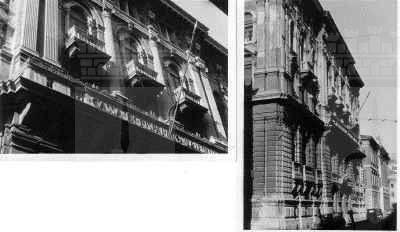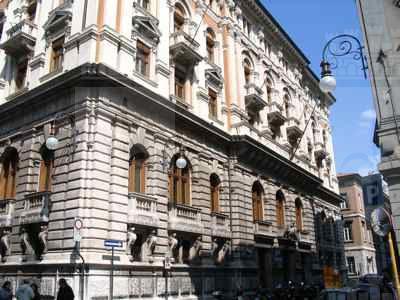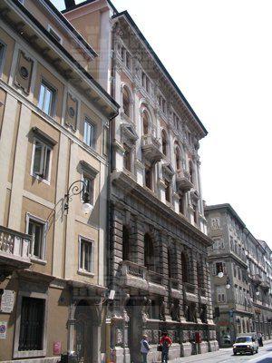 ISCRIZIONE (esterno) Sul parapetto del balcone del secondo piano della facciata principale è collocata l'iscrizione "CASSA DI RISPARMIO TRIESTINA" STEMMA (esterno) Sopra il portale d'ingresso stemma ovale con ape a rilievo e il motto "Lavora Raccogli Aumenta". ELEMENTI ORNAMENTALI (esterno) Riquadri decorativi con motivi geometrici e a nastri in corrispondenza delle specchiature tra i fori dell'ultimo piano. Motivi decorativi a greca alla base dei balconcini del primo piano. MENSOLE (esterno) Mensole a voluta in pietra bianca con testa d'uomo al quarto piano, con zampe e testa leonina al primo piano. Mensole a voluta in pietra bianca con motivo vegetale a sostegno dello sporto di linda e dei balconcini dei piani superiori. PANDURI (esterno) Mascheroni raffiguranti volto umano in chiave di volta in corrispondenza di alcune aperture del primo piano. LESENE (esterno) Lesene scanalate, rifinite a intonaco, con capitello corinzio a livello del secondo e terzo piano. SEMICOLONNE (esterno) Semicolonne scanalate, rifinite a intonaco, con capitello corinzio a livello del secondo e terzo piano del riquadro centrale della facciata principale. BALAUSTRE (esterno) Tutti i balconi sono ornati da balaustre in pietra con balaustrini ad anfora e pilastri angolari.