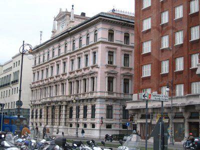 Nel 1883 la società delle Assicurazioni Generali, fondata nel 1831, commissionò all'ingegnere Eugenio Geiringer il progetto per la costruzione di un nuovo palazzo da destinare a sede centrale della compagnia. La costruzione dello stabile ebbe iniziò nel 1884, e terminò nel 1886. A partire dall'agosto del 1886 nel nuovo palazzo di piazza Duca degli Abruzzi, allora via della Stazione, si trasferirono tutti gli uffici che prima si trovavano in Palazzo Carciotti. Il Palazzo delle Generali fu il primo edificio a Trieste ad avvalersi della luce elettrica per l'illuminazione degli uffici. L'edificio, in stile neogreco, fu ampliato nella seconda decade del Novecento con un'ala retrostante. Nel vestibolo è collocato un grande bassorilievo bronzeo raffigurante guerrieri e vittorie alate, opera dello scultore genovese Luigi Supino. Nel 1939 Carlò Sbisa realizzò due affreschi nell'atrio del palazzo.
