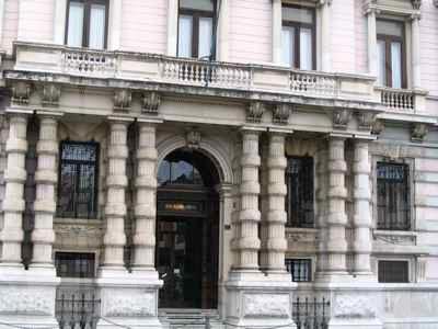 ISCRIZIONE Il timpano sul tetto reca l'iscrizione ASSICURAZIONI GENERALI 1831. COLONNE Colonne binate a sostegno del poggiolo, colonnine scanalate di ordine ionico ai lati delle finestre del primo piano. PARASTE Paraste scanalate con capitello corinzio ai lati delle finestre del secondo piano. BALAUSTRE Le aperture del primo piano presentano finte balaustre in pietra. Il poggiolo è protetto da una balaustra in pietra. OBELISCHI Due obelischi in pietra sono collocati ai lati del timpano.