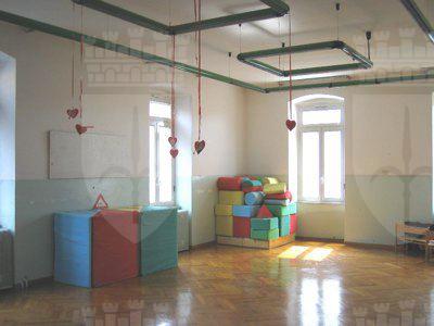 Fascia basamentale trattata a intonaco tinteggiato di grigio. La restante parte delle facciate è intonacata e tinteggiata color rosa; al primo livello è presente un intonaco bugnato liscio a corsi orizzontali. Lesene intonacate in leggero aggetto, tinteggiate in colore grigio e finite con stilature orizzontali. Un marcapiano modanato intonacato separa il primo dal secondo livello; due cornici sono poste all'altezza dei davanzali dei fori del secondo e terzo livello. Al di sotto della banchina, in pietra arenaria intonacata, è presente una fascia di coronamento in intonaco decorata da semplici motivi geometrici. Fori architettonici con cornice in pietra bianca bulinata e gocciolatoio ai primi due livelli; cornice modanata in pietra bianca bulinata al terzo livello. Al primo livello fori protetti da grate in ferro o resi ciechi con tavole di legno. Ulteriori gocciolatoi in lamiera al secondo livello. Foro del portone d'ingresso con cornice in pietra bianca bulinata, architrave e gocciolatoio modanato sostenuto da due reggimensole. Tutti i serramenti sono in PVC color bianco a due specchiature e sopraluce; fanno eccezione i fori del vano scale in vetrocemento. Portone d'ingresso ligneo a due battenti con sopraluce protetto da inferriata. La struttura della doppia rampa è in pietra arenaria a vista con gradini in pietra bianca bulinata e parapetto in ferro. Gronda e pluviali esterni in lamiera verniciata color bianco. Muro perimetrale in pietra arenaria e cemento con portone e parapetti in ferro verniciato color rosso. Giardino pavimentato con ghiaia (IMG_1176). Atrio d'ingresso e corridoi con pavimento alla veneziana. Aule gioco e uffici pavimentate con listelli di legno; mensa con linoleum; locali del sottoscala e cucine con piastrelle; sottotetto con tavoloni di legno e mattonelle. Scala appoggiata con gradini in pietra bianca bulinata (IMG_1170) rivestiti in alcune rampe con materiale plastico antiscivolo. Putrella in ferro di supporto. Parapetto in ferro verniciato di color verde e passamano in legno.