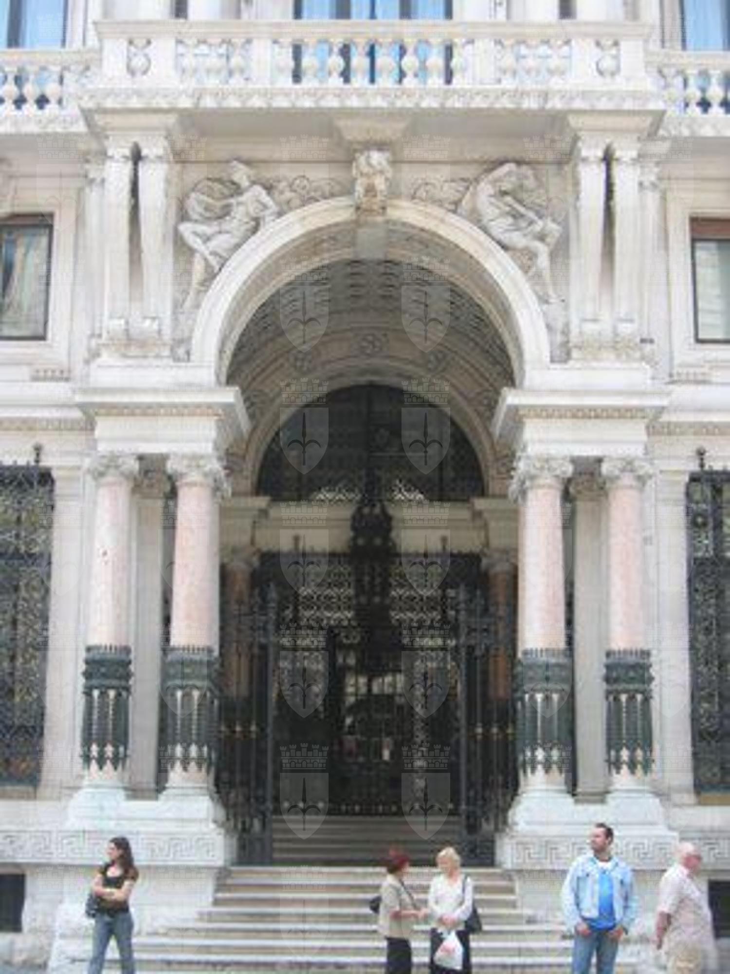 Il palazzo viene realizzato tra il 1909 ed il 1914 per ospitare la sede della Riunione Adriatica di Sicurtà su progetto degli architetti Ruggero ed Arduino Berlam. I problemi relativi all'ideazione dell'edificio sono abbastanza complessi: dalla scelta del terreno per la nuova sede, all'idea di bandire un concorso per il progetto fino alla realizzazione. Nel 1902 Adolfo de Frigyessy, direttore della Compagnia dal 1899, decide acquistare un'area centrale della città tra via Dante Alighieri, Santa Caterina, Corso Italia e piazza Nuova, oggi piazza della Repubblica. Sette anni dopo la società bandisce un concorso ad inviti per il progetto dell'edificio al quale partecipano dieci concorrenti; Ruggero ed Arduino Berlam si aggiudicano l'incarico con un disegno scenografico e monumentale arricchito da sculture e oggetti di design per l'allestimento interno. L'edificio viene arretrato di alcuni metri rispetto alle vecchie costruzioni permettendo una maggiore possibilità di lettura della struttura. Attualmente l'edificio ospita al pianterreno attività commerciali e uffici ai piani superiori.