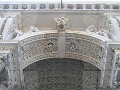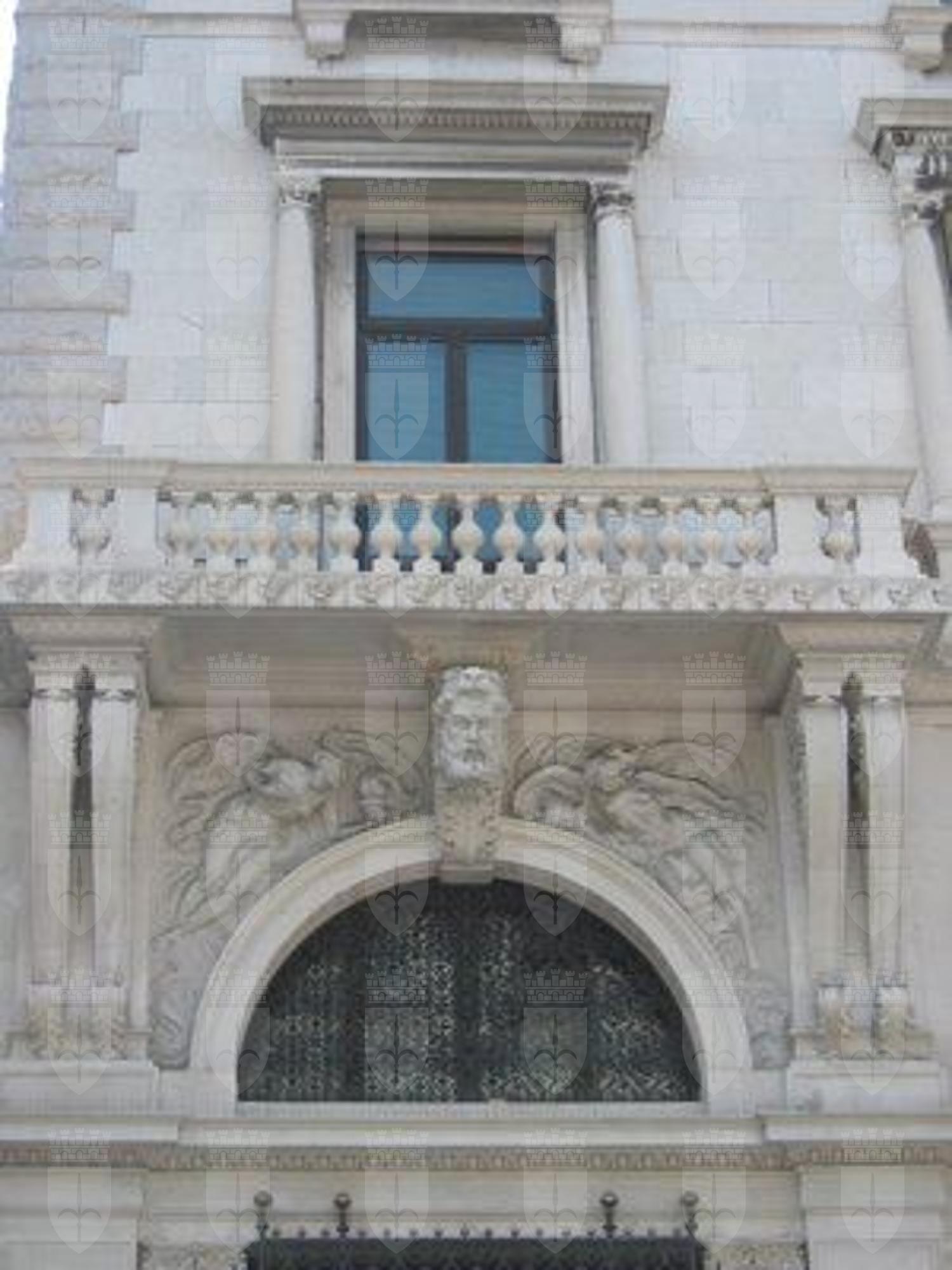 ELEMENTI ORNAMENTALI (esterno): Elementi decorativi a motivi floreali in pietra a rilievo in corrispondenza delle specchiature tra i fori architettonici all'ultimo piano e dello sporto di linda. ELEMENTI ORNAMENTALI (esterno): Chiave di volta a decorazione degli archi a tutto sesto, raffigurante volto di uomo scolpito in pietra. MENSOLE (esterno): Mensole a voluta in pietra a sostegno dei balconi e dello sporto di linda. BALAUSTRE (esterno): Parapetto dei balconi in pietra con balaustrini ad anfora. STATUE (esterno): Statue poste in corrispondenza dell'ammezzato nelle lunette della facciata principale raffiguranti le personificazioni di Fuoco e Aria, Pensiero e Azione, Acqua e Terra, eseguite dallo scultore Giovanni Mayer. STATUE (esterno): Statue poste in corrispondenza del secondo piano della facciata principale raffiguranti le personificazioni della Previdenza e della Protezione, eseguite dallo scultore Gianni Marin.