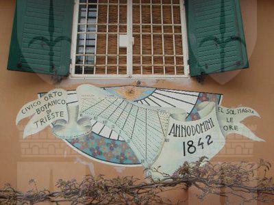 PITTURA (esterno): dipinto a colori, accostato alla meridiana inserita nel prospetto meridionale del corpo principale, raffigurante un sole e una pergamena con grafici per il calcolo del tempo e alcune scritte, tra queste:"CIVICO ORTO BOTANICO DI TRIESTE", "ANNO DOMINI 1842" e l'espressione dialettale "EL SOL MAGNA LE ORE". INCISIONE (esterno): su una delle lastre lapidee che costituiscono la pavimentazione posta in corrispondenza dell'ingresso all'area è stata incisa una rosa dei venti orientata secondo i punti cardinali. STATUA (esterno): busto in pietra su piedistallo squadrato di Bartolomeo Biasoletto, collocato, in onore del botanico dignanese, all'interno di un'aiuola nel livello più basso del giardino.
