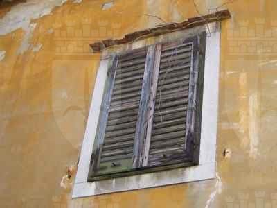 Fascia basamentale in finto bocciardato con intera facciata e androna d'ingresso intonacate color giallo. Finti conci in rilievo intonacati ai lati del corpo centrale. Portone inserito in un foro ad arco a tutto sesto e composto da un'intelaiatura lignea con battente a doppia specchiatura nella parte inferiore e doppie specchiature ai lati; due cippi in pietra bianca bulinata alla base dei piedritti del foro (IMG_0808). Serramenti esterni tutti in legno a quattro specchiature, ma di diverse tipologie: al piano terra fori quadrati a doppia specchiatura con cornice in pietra bianca bulinata, in cui è inserita un'inferriata in ferro, sovrastati da gocciolatoi in mattoni e tavelle di terracotta (IMG_0803); al piano superiore fori rettangolari a sei specchiature con cornici in pietra bianca bulinata e gocciolatoi in tavelle di terracotta (IMG_0802). Fori del primo piano privi di grate, ma muniti di oscuranti, sempre in legno. Il foro circolare dell'ultimo livello con cornice in mattoni e serramento di forma quadrata presumibilmente in alluminio. Terrazzo cinto da pilastrini in pietra, ringhiera in ferro e struttura in ferro a formare un pergolato al piano superiore del lato volto a valle. Androna pavimentata con lastroni di pietra arenaria e coperta solo in parte causa il crollo del solaio sovrastante (IMG_0820). Sulla sinistra tre porte d'accesso al volume laterale: tutte con cornice in pietra bianca bulinata, le prime due con sopraluce anch'esso con cornice di ugual fattura. Sul fondo si apre un arco uguale e simmetrico a quello del portone d'entrata. Sulla destra altri due archi uguali a quelli sopra descritti: uno, attraverso un scala in pietra, porta alla porzione di parco che sta a valle, l'altro ad un cortile interno. Nel mezzo una porta in ferro sovrastata da un travetto in acciaio posto da architrave (IMG_0822). Accanto al portone un'altra porta con cornice in pietra bianca bulinata che conduce ai locali dei volumi laterali. Pluviali esterni alla muratura perimetrale in ferro così come la gronda.
