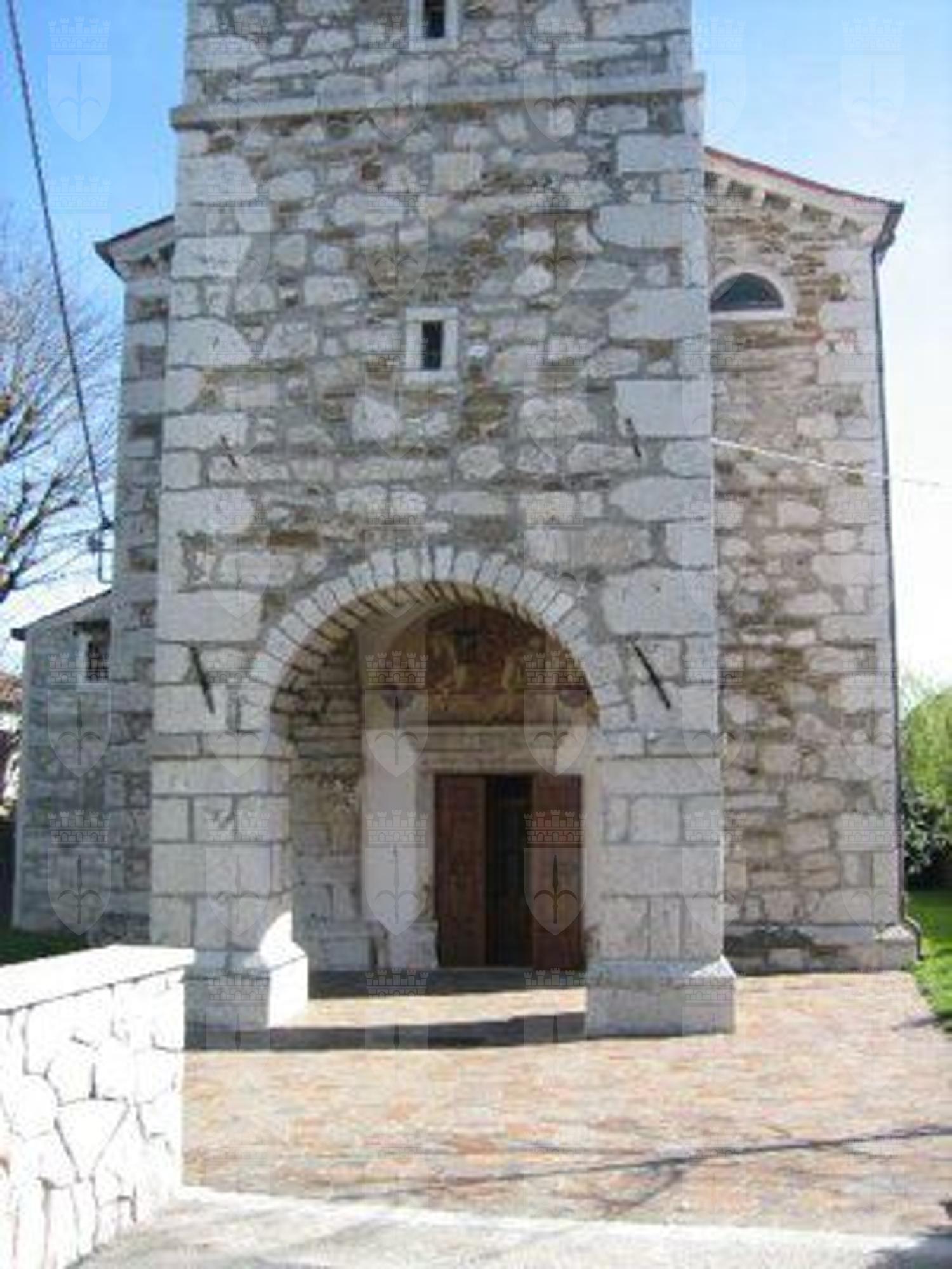 Complesso architettonico composto dalla chiesa storica dell'abitato di Prosecco. La chiesa è a pianta centrale con navata unica e presenta una facciata a capanna con campanile centrale sorretto da quattro archi a tutto sesto che ne costituiscono l'ingresso voltato. Struttura portante in pietra arenaria a vista nella facciata principale e intonacata nelle restanti facciate, abside segmentato e corpi accessori addossati lungo il fianco sinistro. Copertura a falde inclinate con manto in coppi curvi rossi, pluviali e gronde in lamiera con verniciatura. Aperture regolari e di piccole dimensioni con cornici in pietra bianca squadrata, due mezzelune sulla facciata principale e finestre ad arco allungate sul fianco destro. Il campanile presenta aperture a bifora con colonnina centrale e una balaustra in pietra. L'ingresso principale è costituito da un portale in pietra con mensola aggettante superiore e affresco decorativo nel sopraluce. Internamente la chiesa presenta soffitto, abside e pareti decorate ad affresco con motivi floreali e scene bibliche; l'altare è in marmo; il coro, in posizione rialzata sopra l'ingresso, è sorretto da due pilastri in marmo e presenta un parapetto ligneo con decorazioni pittoriche.