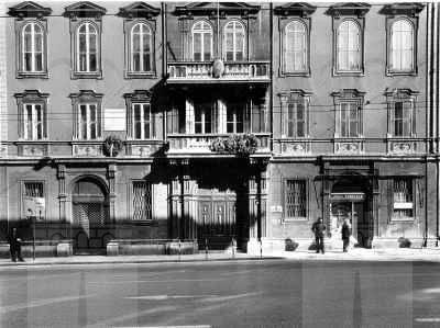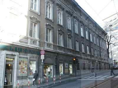Serramenti esterni tutti in legno, di diverse tipologie: al piano terra doppie finestre rettangolari a quattro specchiature con cornice in pietra bianca bulinata ed inferriata in ferro battuto; al primo piano doppie finestre rettangolari a quattro specchiature, con edicola in pietra bianca a decorazione del foro architettonico e motivo geometrico a rilievo nella specchiatura sotto il davanzale in pietra; al secondo piano doppie finestre arcuate a sei specchiature, decorate da cornice a rilievo in pietra bianca e timpano triangolare nella parte superiore; al terzo piano finestre metalliche singole ellittiche con cornice in pietra bianca sul fronte principale (PICT0027.JPG), doppie rettangolari in legno con apertura ad anta sui fronti secondari. Finestre tutte rettangolari in legno con cornice semplice in pietra sui fronti affacciati sul cortile interno. Al piano terra finestre rettangolari con serramenti oscuranti in legno a doghe incrociate in corrispondenza del Bar Tartini sulla via Martiri della Libertà. Portali al piano terra in legno massello intarsiato, incorniciati da edicole in pietra bianca di diversa fattura. Fori commerciali con ampie vetrate con telaio e cassonetto in ferro verniciato. Serramenti interni in acciaio verniciato nelle aule e nelle parti comuni; in legno massello intarsiato, con cornici in marmo scuro o legno in corrispondenza dei locali di rappresentanza. Edicola decorativa sulla facciata principale sviluppata a tutta altezza in corrispondenza dell'ingresso (PICT0039.JPG). Paraste in pietra binate con motivi geometrici a forma piramidale a lato del portale ligneo a sostegno di quattro mensoloni a voluta, posti a loro volta a sostegno del balcone con parapetto in pietra bianca e balaustrini a sezione circolare. Balcone al secondo piano con due finestre arcuate binate, decorate da edicola con timpano triangolare. Marcapiano a livello del solaio del quarto piano con semplici modanature a dentello rompigoccia; sporto di linda con banchina in pietra bianca sostenuto da mensole a voluta e decorato da una doppia modanatura ad ovuli sovrastata da dentelli rompigoccia. Pluviali in acciaio zincato esterni in facciata lato strada solo tra il solaio del primo e del terzo piano, sotto forma di colonnine posizionate secondo i ritmi di facciata. Sulle altre facciate, pluviali e gronde in ferro verniciato. Atrio d'ingresso con pavimento in marmo di Aurisina, delimitato da colonne marmoree con capitello corinzio, sovrastato da soffitto decorato da motivi geometrici a stucco. Vano scala principale di carattere monumentale (PICT0056.JPG), sovrastato da volta a padiglione decorata con motivi a stucco con lucernario vetrato a specchiature rettangolari e lampadario a candelabro in ferro battuto; gradini in pietra bianca bulinata sostenuto da colonnine in marmo rosso con capitello corinzio e parapetto in pietra bianca con corrimano in ottone lucido recentemente applicato; pareti decorate con specchiature in spatolato alla veneziana e cornici in stucco. Pavimento intarsiato a motivi geometrici in marmo bianco, rosso e nero in corrispondenza dei pianerottoli. Anfore in pietra bianca ad uso fioriera a decorazione del parapetto dell'ultimo livello della scala. Vano scala secondario di tipo appoggiato con gradini in pietra bianca bulinata, pianerottoli in pietra d'Aurisina tipo "fiorita", parapetto in ferro verniciato con motivi a voluta e corrimano in legno. Scala di accesso al terzo piano di tipo appoggiato in calcestruzzo armato, con gradini rivestiti in pietra d'Aurisina tipo "fiorita", parapetto in ferro verniciato a bacchette verticali e corrimano in legno. Scala esterna di accesso all'appartamento del custode, di tipo a mensola, con gradini in pietra bianca, parapetto in ferro verniciato decorato a volute. Baldacchino in ferro verniciato a protezione della porta d'ingresso all'alloggio con copertura a due falde inclinate e gronda di raccolta acque meteoriche (PICT0031.JPG). Aula magna in stile barocco con volta a padiglione decorata da motivi a stucco e pietra bianca, ampie superfici specchiate, pavimento in legno intarsiato a motivi geometrici, lampadari e candelabri a parete con pendagli in cristallo e tendaggi in velluto pesante di colore scuro. Ampliamento con struttura in telaio di acciaio zincato e serramenti in alluminio verniciato colore marrone, vetrati a tutta altezza, suddivisi in specchiature rettangolari, formante nell'area centrale un patio rettangolare trattato a giardino. Nelle parti rinnovate, pavimenti in quadroni di linoleum, controsoffitti in listoni di alluminio, illuminazione a mezzo di lampade al neon. Nelle aule dell'ultimo piano, controsoffitti in cartongesso o pannelli eraclit.