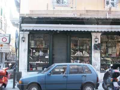 Basamento della facciata principale in pietra bianca bulinata. Paraste rifinite ad intonaco scandiscono il ritmo di facciata. Serramenti vetrati in legno a specchiatura unica di grandi dimensioni, ritmati da colonnine in ghisa verniciate con capitello in stile corinzio. Serrande metalliche e cassonetto superiore in legno. Fanali metallici di recente fattura ancorati alle paraste sulla facciata principale. Facciate laterali rifinite ad intonaco.