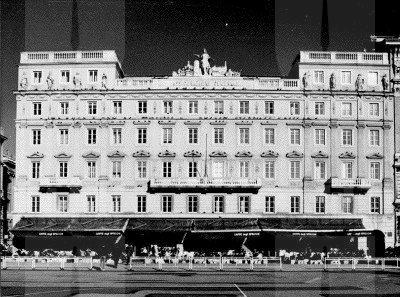 STATUE Il gruppo scultoreo collocato sulla sommità dell'immobile, fu realizzato dal veneziano Luigi Zandomeneghi, e simboleggia le arti, l'industria, la navigazione e il commercio. Un particolare curioso è rappresentato dal modello della prima locomotiva usata dall'Austria. Altre statue sono poste tra le finestre dell'ultimo piano a livello delle sopraelevazioni laterali della facciata. ISCRIZIONE Al centro della balaustra di coronamento prospiciente piazza dell'Unità un riquadro reca scolpita la scritta "Assicurazioni Generali", eseguita nel 1872. LESENE Lesene di ordine gigante con capitello ionico sulla facciata principale. PARASTE Paraste scanalate di ordine gigante con capitello dorico sulle facciate laterali BALAUSTRE Parapetti in pietra e in ferro battuto ornano i balconi.
