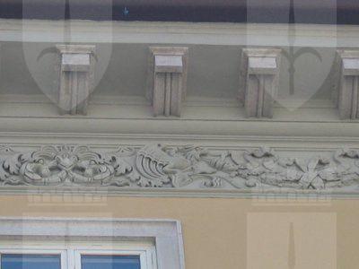 PANDURO (esterno) Il panduro collocato in chiave d'arco della Portizza raffigura un Ercole incappucciato da una testa di leone, con le zampe incrociate sotto al mento BASSORILIEVI (esterno) Un fregio a bassorilievo con motivi vegetali e allegorici corona la parte superiore del tetto. Le Lunette delle finestre del primo piano sono decorate con dei motivi allegorici a bassorilievo.