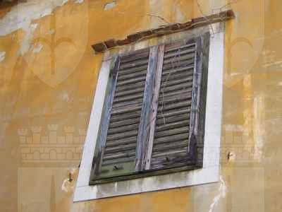Fascia basamentale in finto bocciardato con intera facciata e androna d'ingresso intonacate color giallo. Finti conci in rilievo intonacati ai lati del corpo centrale. Portone inserito in un foro ad arco a tutto sesto e composto da un'intelaiatura lignea con battente a doppia specchiatura nella parte inferiore e doppie specchiature ai lati; due cippi in pietra bianca bulinata alla base dei piedritti del foro (IMG_0808). Serramenti esterni tutti in legno a quattro specchiature, ma di diverse tipologie: al piano terra fori quadrati a doppia specchiatura con cornice in pietra bianca bulinata, in cui è inserita un'inferriata in ferro, sovrastati da gocciolatoi in mattoni e tavelle di terracotta (IMG_0803); al piano superiore fori rettangolari a sei specchiature con cornici in pietra bianca bulinata e gocciolatoi in tavelle di terracotta (IMG_0802). Fori del primo piano privi di grate, ma muniti di oscuranti, sempre in legno. Il foro circolare dell'ultimo livello con cornice in mattoni e serramento di forma quadrata presumibilmente in alluminio. Terrazzo cinto da pilastrini in pietra, ringhiera in ferro e struttura in ferro a formare un pergolato al piano superiore del lato volto a valle. Androna pavimentata con lastroni di pietra arenaria e coperta solo in parte causa il crollo del solaio sovrastante (IMG_0820). Sulla sinistra tre porte d'accesso al volume laterale: tutte con cornice in pietra bianca bulinata, le prime due con sopraluce anch'esso con cornice di ugual fattura. Sul fondo si apre un arco uguale e simmetrico a quello del portone d'entrata. Sulla destra altri due archi uguali a quelli sopra descritti: uno, attraverso un scala in pietra, porta alla porzione di parco che sta a valle, l'altro ad un cortile interno. Nel mezzo una porta in ferro sovrastata da un travetto in acciaio posto da architrave (IMG_0822). Accanto al portone un'altra porta con cornice in pietra bianca bulinata che conduce ai locali dei volumi laterali. Pluviali esterni alla muratura perimetrale in ferro così come la gronda.