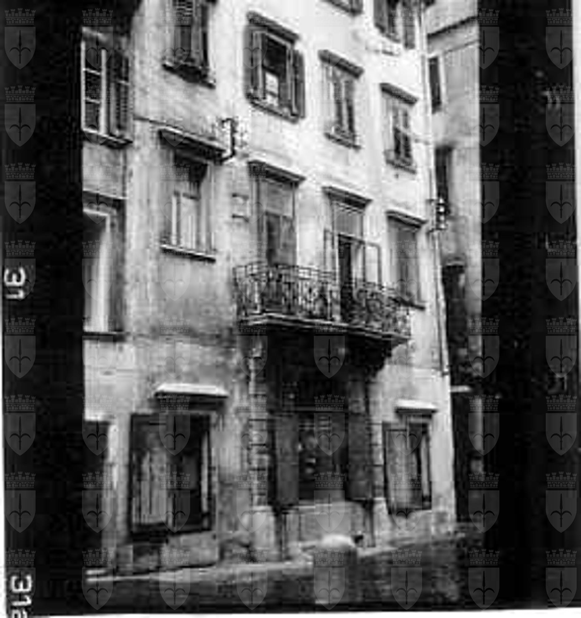 La struttura, a pianta rettangolare, è costituita da quattro piani fuori terra più sottotetto. Affaccio principale su Via delle Ombrelle, secondario su Piazza Vecchia. Il pianoterra è caratterizzato da aperture architettoniche con destinazione commerciale, mentre ai piani superiori si aprono fori finestra rettangolari con cimasa lineare in pietra. Cornice marcapiano al di sopra del quarto piano. La superficie muraria è trattata ad intonaco grigio. Nel prospetto su Piazza Vecchia l'asse di simmetria viene enfatizzato dalla presenza di un ampio portale inquadrato da una struttura in pietra; il portone ad arco a tutto centro presenta una voluta in chiave di volta. Tre volute in pietra sostengono il balcone collocato al centro del primo piano, caratterizzato da un parapetto è in ferro battuto con decorazioni geometriche. Sul balcone si apreno due porte finestra con cornice lineare in pietra.