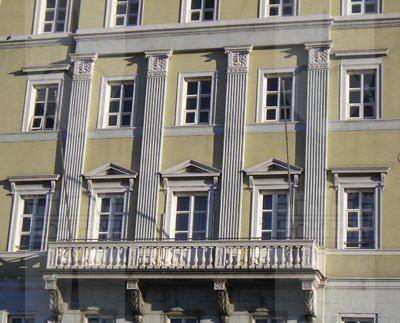 BALAUSTRA (esterno): Balcone con parapetto a balaustre ad anfora in corrispondenza delle parti aggettanti del primo piano. PARASTE (esterno): Paraste scanalate di ordine tuscanico tra primo e secondo piano in corrispondenza delle parti aggettanti. RILIEVI (esterno): Tondi decorativi raffiguranti le parti del mondo, opera di Pietro Zandomeneghi. Rettangoli scolpiti a bassorilievo da Giuseppe Moscotto e Giovanni Depaul rappresentano l'Onore, l'Industria, la Navigazione, la Riflessione, la Religione, la Costanza, la Beneficenza e il Commercio. I rilievi sono collocati negli spazi tra i fori architettonici del pianoterra.