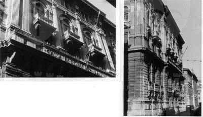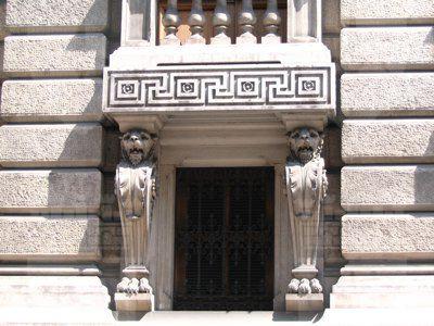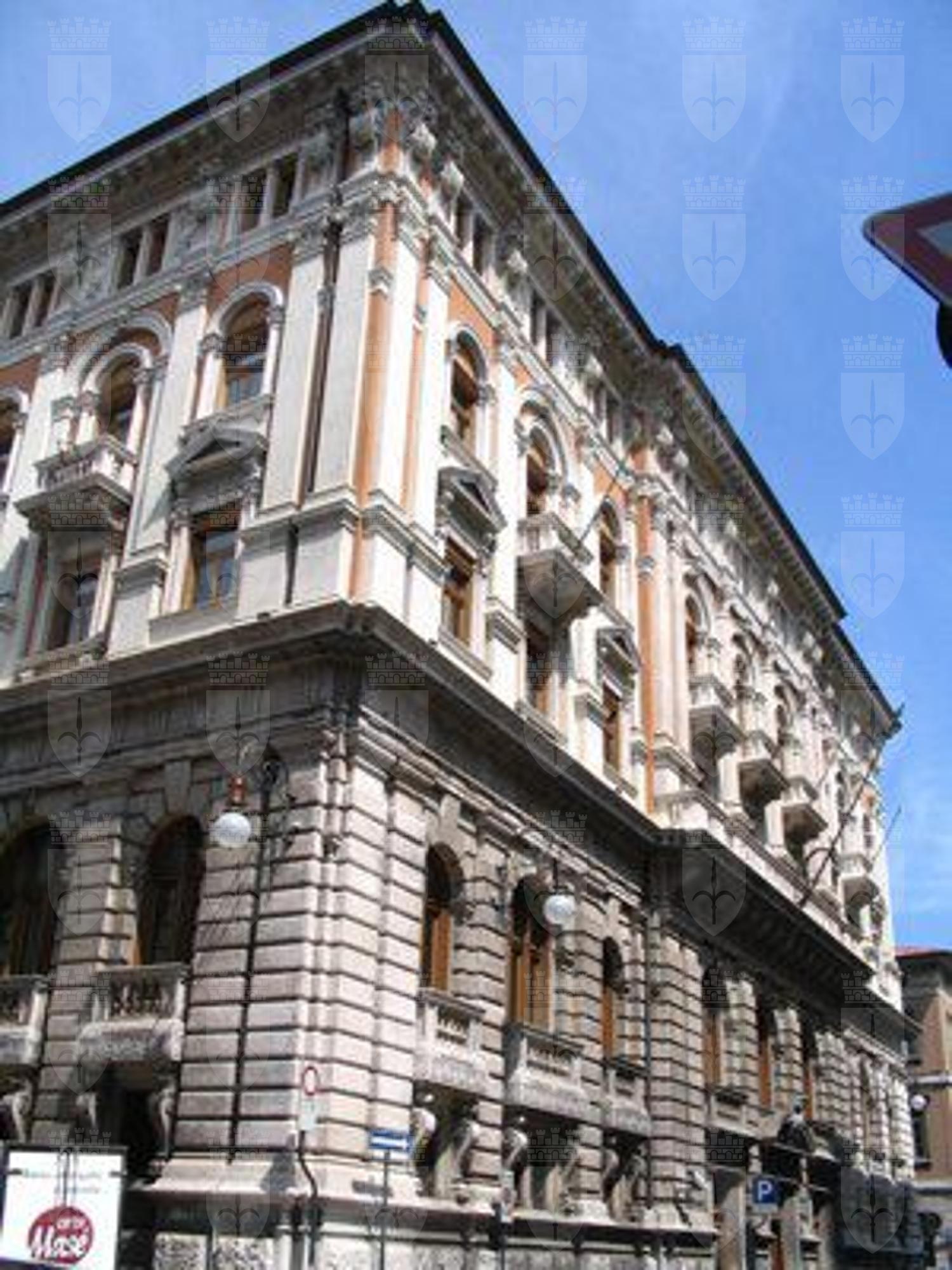 ISCRIZIONE (esterno) Sul parapetto del balcone del secondo piano della facciata principale è collocata l'iscrizione "CASSA DI RISPARMIO TRIESTINA" STEMMA (esterno) Sopra il portale d'ingresso stemma ovale con ape a rilievo e il motto "Lavora Raccogli Aumenta". ELEMENTI ORNAMENTALI (esterno) Riquadri decorativi con motivi geometrici e a nastri in corrispondenza delle specchiature tra i fori dell'ultimo piano. Motivi decorativi a greca alla base dei balconcini del primo piano. MENSOLE (esterno) Mensole a voluta in pietra bianca con testa d'uomo al quarto piano, con zampe e testa leonina al primo piano. Mensole a voluta in pietra bianca con motivo vegetale a sostegno dello sporto di linda e dei balconcini dei piani superiori. PANDURI (esterno) Mascheroni raffiguranti volto umano in chiave di volta in corrispondenza di alcune aperture del primo piano. LESENE (esterno) Lesene scanalate, rifinite a intonaco, con capitello corinzio a livello del secondo e terzo piano. SEMICOLONNE (esterno) Semicolonne scanalate, rifinite a intonaco, con capitello corinzio a livello del secondo e terzo piano del riquadro centrale della facciata principale. BALAUSTRE (esterno) Tutti i balconi sono ornati da balaustre in pietra con balaustrini ad anfora e pilastri angolari.