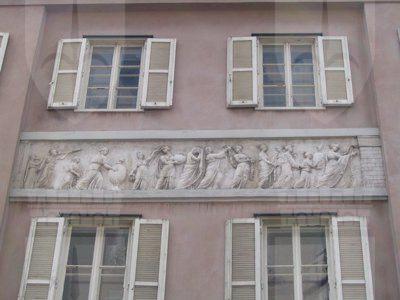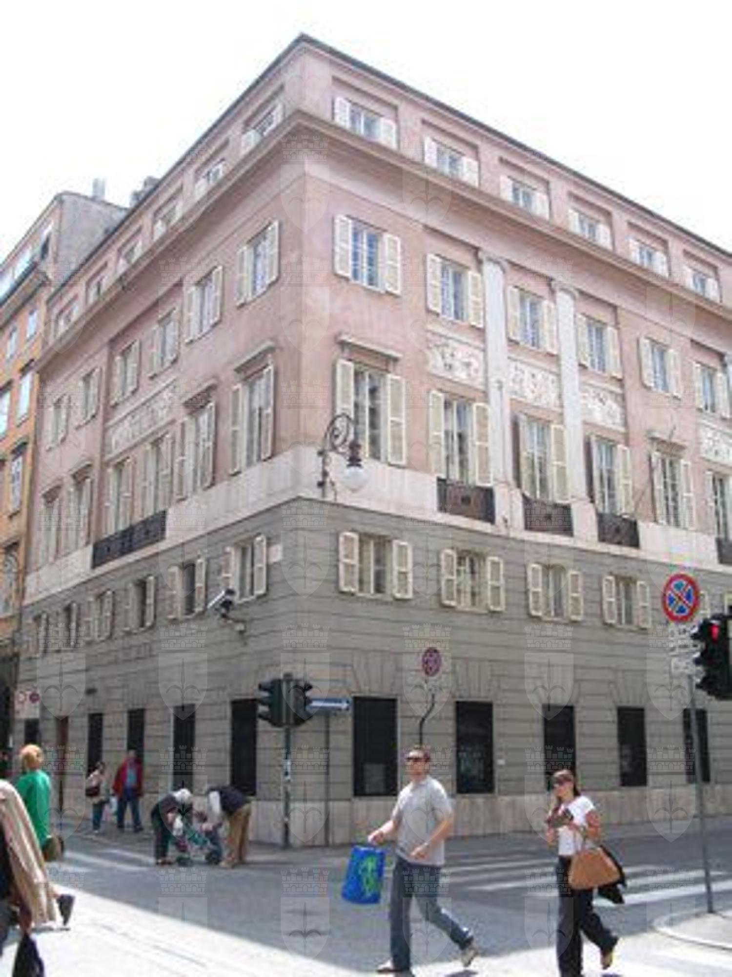 FREGI (esterno) I pannelli a bassorilievo raffigurano temi classici tratti dal repertorio antico quali baccanali, are sacrificali, cortei di suonatori e personaggi tratti dalla mitologia. BALAUSTRE (estreno) Su tutte le facciate la continuità della fascia marcapiano è spezzata da balaustre in ferro battuto a creare dei finti balconi. LESENE (esterno) Sul prospetto prospiciente via Roma sono presenti lesene lisce di ordine gigante con capitello ionico all'altezza del terzo e quarto livello