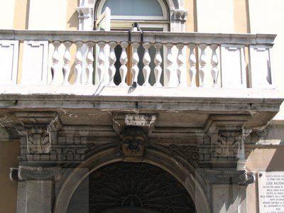 ELEMENTI ORNAMENTALI (esterno) All'ultimo piano, tra le finestre, sono presenti dei riquadri decorativi con un motivo floreale nel tondo centrale. PANDURO (esterno) Un panduro raffigurante una testa d'uomo è collocato in chiave di volta del portale d'ingresso principale. BALCONE (esterno) Il balcone presenta un parapetto con balaustrini in pietra bianca. LESENE (esterno) Lesene trattate ad intonaco e prive di capitello decorano la facciata all'altezza del secondo e terzo livello.