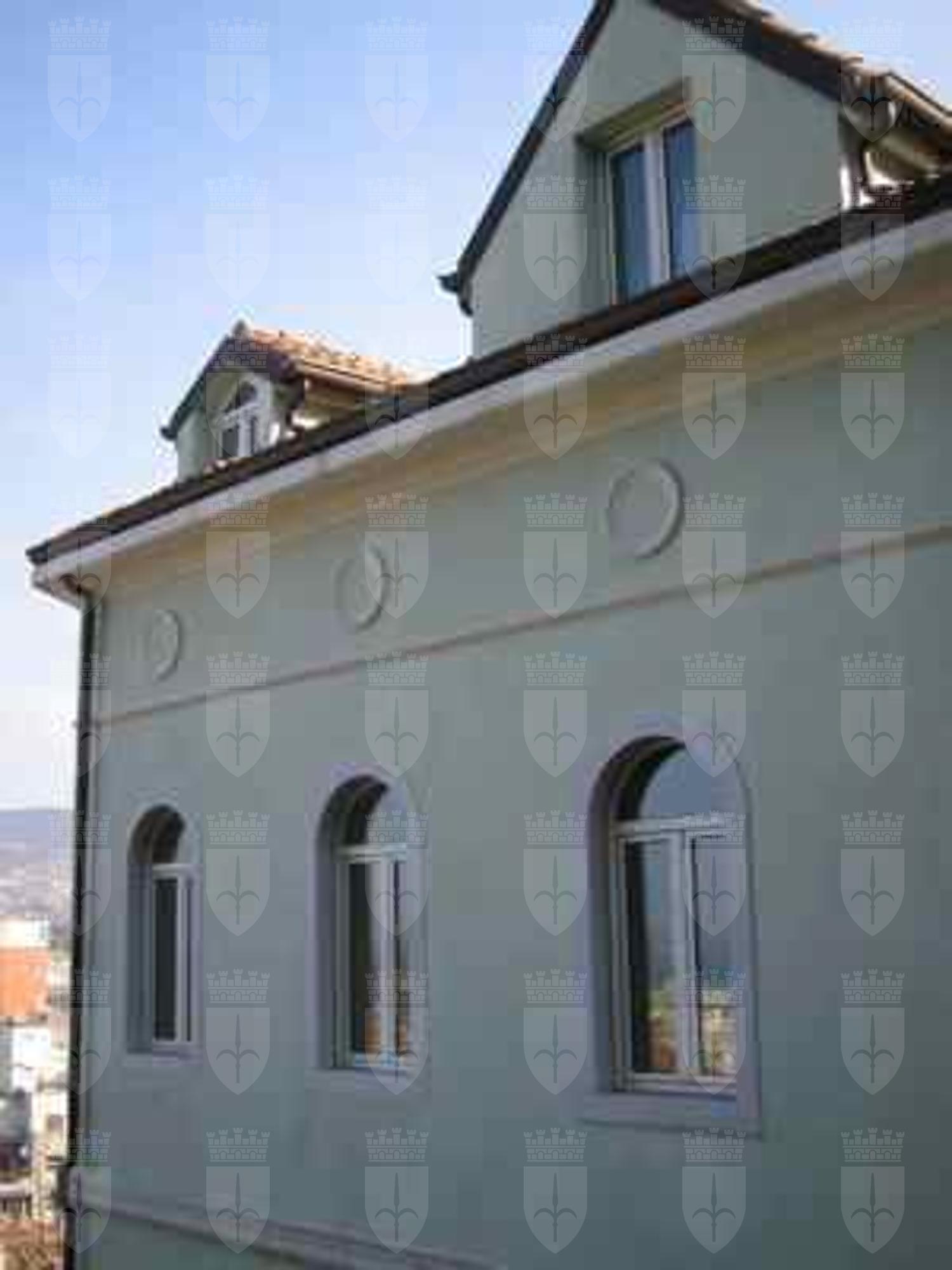 Fascia basamentale trattata a finto bugnato liscio a corsi orizzontali e tinteggiatato color grigio. Facciata interamente intonacata e tinteggiata color verde pastello, spezzata da due marcapiani modanati in pietra bianca e una cornice a fascia continua in pietra calcarea bianca posta tra i fori del terzo livello e la linda. Tra la cornice e la linda tredici anelli modanati in pietra bianca (IMG_0985). Volume secondario interamente intonacato e tinteggiato color verde pastello. L'accesso è garantito da una scala con gradini in pietra bianca bulinata che termina in un pianerottolo in lastre di pietra arenaria. Giardino retrostante pavimentato in lastre di pietra arenaria; giardino antistante in lastre grezze di pietra arenaria. Serramenti in alluminio color bianco a due specchiature con, al secondo e terzo livello, sopraluce. Nella fascia basamentale il foro che dà sulla scala presenta un'inferriata in ferro battuto. Fori del secondo e terzo livello ad arco con cornice in pietra bianca. Nel fabbricato secondario fori del primo livello rettangolari, di cui solo uno con cornice in pietra c Calcarea bianca. Al livello superiore fori ad arco con cornice in pietra bianca. Superiormente un foro orbicolare con cornice in pietra bianca e serramenti a due specchiature. Portone d'ingresso su Via dell'Asilo in ferro a due battenti (IMG_0965). Accesso all'edificio tramite una porta in alluminio color bianco a due battenti. Accesso al piano inferiore del fabbricato secondario con portoncino in alluminio verniciato grigio. Linda in calcestruzzo. Grondaia e pluviali esterni in lamiera verniciata color marrone. All'interno corridoi e servizi pavimentati con piastrelle (IMG_0975); aule e mensa con linoleum (IMG_0976). Scala in pietra bianca bulinata retta da volte in pietra (IMG_0972). Trave in acciaio a sostenere lo sbalzo delle rampe. Parapetto in ferro battuto con corrimano in legno.