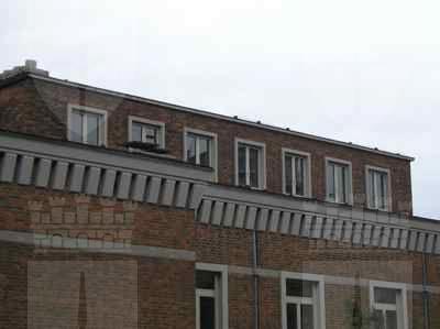 CORNICE: cornice del tetto composta da una serie di grossi dentelli a forma di cuneo in pietra massiccia, cinti superiormente da una sopracornice in lastre di pietra lisca. MARCAPIANO: in pietra artificiale posta a filo della muratura con blocchi sagomati per l'inserimento del pluviale.