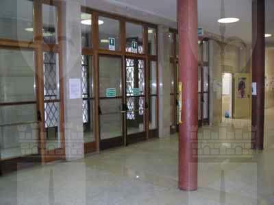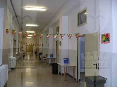 Il paramento murario esterno del piano terra, rivestito con lastre di pietra bocciardate, è delimitato, superiormente, da una cornice in pietra. Le facciate dei piani superiori sono rivestite da mattoni a faccia vista e da cornici in pietra artificiale, poste all'altezza del davanzale e dell'architrave dei fori. La cornice del tetto è realizzata con conci di pietra artificiale a forma di mensola posti su una fascia non modanata in pietra artificiale. Il rivestimento dei pilastri a sezione quadrata e dell'architrave del portico è costituito da lastre di pietra artificiale bocciardate, similari al rivestimento del paramento murario del piano terra. I fori del piano terra, di forma rettangolare, sono protetti da una grata in ferro saldato e provvisti di infisso in alluminio a due ante con quattro specchiature in vetro e sopraluce a vasistas. I fori dei piani superiori e le porte-finestre del terrazzo sono dotati di cornice modanata in pietra artificiale; l'infisso è in alluminio verniciato di colore bianco, a due ante con quattro specchiature in vetro e sopraluce a vasistas. Il terrazzo, ricavato sulla copertura piana del portico, è pavimentato con mattonelle in pietra ed è delimitato da una ringhiera in ferro. La scala d'ingresso è fiancheggiata da spallette in muratura, rivestite con lastre in pietra artificiale bocciardate. La struttura della scala è in muratura, rivestita con lastre in pietra a forma irregolare sulla superficie delle pedate; le alzate sono realizzate con blocchi squadrati di pietra massiccia naturale. I fori d'ingresso sono costituiti da tre alti portoni, di forma rettangolare, intervallati da setti murari rivestiti da lastre di pietra artificiale. I serramenti dei portoni d'ingresso sono in ferro, a sei specchiature vetrate protette con una grata in ferro saldato; l'atrio di ingresso è caratterizzato da una parete vetrata con telaio in legno dotato di sopraluce. La superficie delle pareti dell'atrio d'ingresso e del vano scala è rivestita con lastre di pietra artificiale levigata. La pavimentazione dei corridoi è in mattonelle di graniglia policroma; nei locali di servizio e nei pianerottoli del vano scala è in piastrelle di ceramica. La pavimentazione delle aule e degli uffici è in parquet. Le porte delle stanze sono in legno verniciato, ad un'unica anta. Le porte di collegamento con i corridoi e il vano scala sono in ferro con maniglia antipanico. La scala è in muratura con scalini rivestiti da lastre di marmo. La ringhiera è in ferro saldato verniciato con corrimano in legno e poggia su una spalletta in muratura.