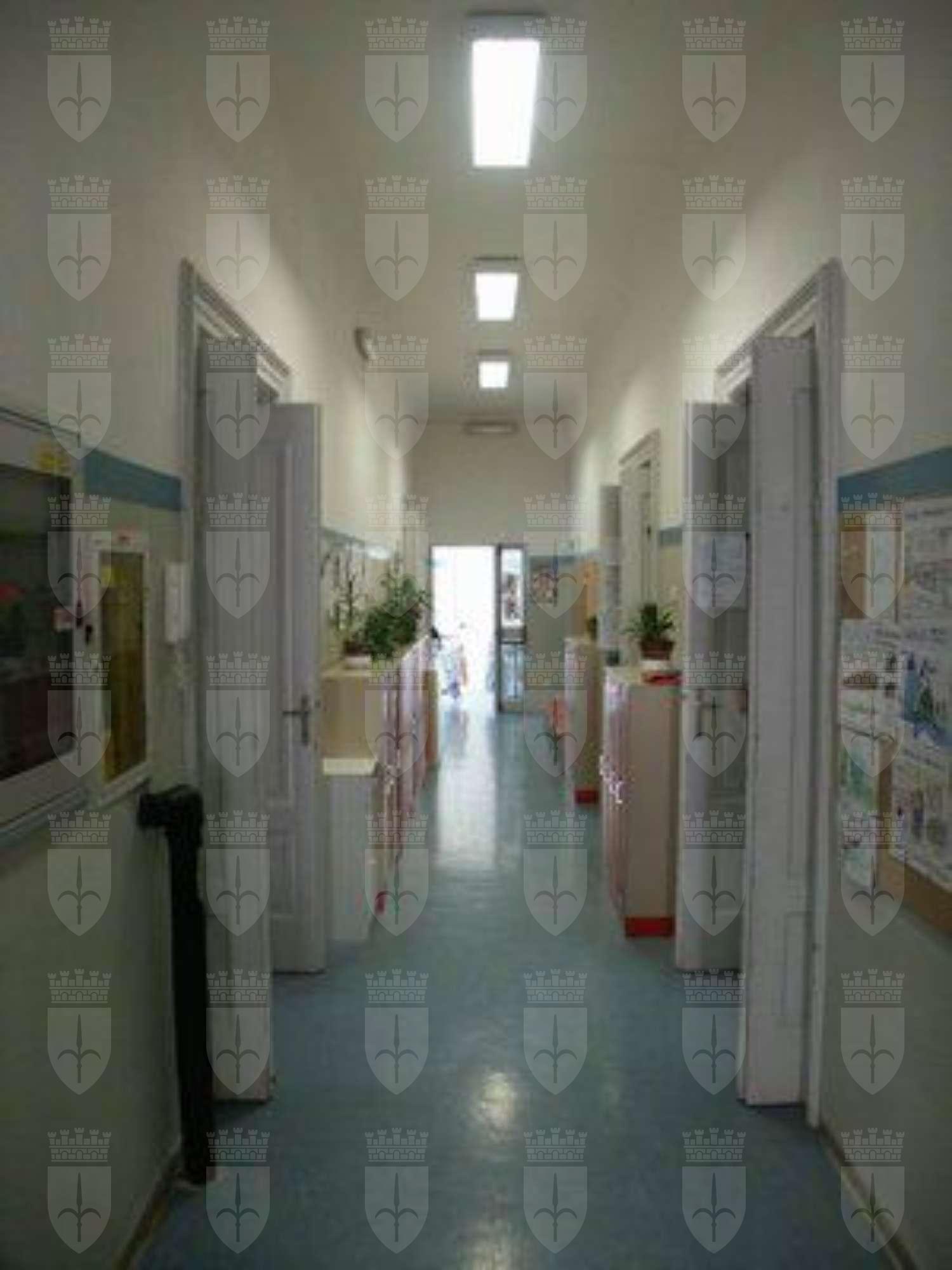 Serramenti esterni in alluminio verniciato bianco a due ante con sopraluce vetrato. Abbassamento in pietra bianca bocciardata a correre lungo tutto il perimetro dell'edificio; superficie di facciata trattata a finto bugnato ad intonaco in corrispondenza del piano terra; marcapiano modanato in pietra bianca a correre lungo l'intero perimetro dell'edificio. Sul prospetto rivolto verso il cortile interno, due fori architettonici risultano tamponati in muratura rifinita ad intonaco. Scala esterna di accesso al cortile in pietra bianca bocciardata. Banchina trattata ad intonaco, gronda e pluviale in lamiera. Copertura a padiglione con manto in coppi curvi rossi uso Trieste. Serramenti interni originali in legno massello verniciato colore grigio in corrispondenze delle aule; pavimento in linoleum nell'atrio di ingresso, in battuto di cemento e graniglia nei corridoi al piano terra, in parquet ligneo nelle aule; scala in pietra bianca bocciardata, rivestita in lineoleum, balaustra in ferro verniciato decorata da motivi geometrici e corrimano ligneo; corridoio al primo piano pavimentato in linoleum. Superfici murarie intonacate colore bianco e controsoffitto a sospensione con correnti in alluminio e pannelli alleggeriti.