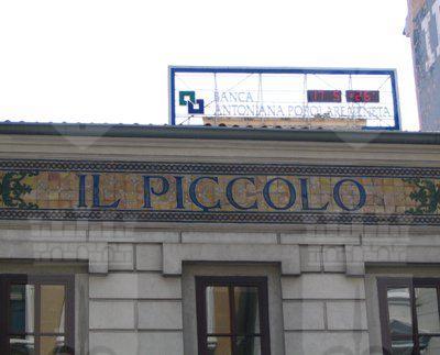 La struttura presenta pianta rettangolare e due piani fuori terra. Affaccio principale su Piazza Carlo Goldoni e secondario su Via Silvio Pellico. La facciata principale presenta fori commerciali al pianterreno, caratterizzato da rivestimento in pietra grigia; al centro si apre un portale ad arco a tutto sesto, con mensola in chiave di volta, affiancato da semicolonne lisce e semipilastri a fasce con capitello corinzio, a sostegno del balcone con parapetto in ferro battuto del secondo piano. Il piano superiore, trattato ad intonaco giallo, è caratterizzato da una serie di diciannove fori finestra, con cimasa lineare in pietra bianca e cornice marcapiano a sostegno dei davanzali. In corrispondenza della parte centrale della facciata si trova una sopraelevazione, coronata da timpano, su cui si aprono tre fori finestra. Il prospetto su Via Silvio Pellico presenta pianterreno con rivestimento a bugnato rustico e cinque archi a tutto sesto, e piano superiore a bugnato liscio e cinque fori finestra con cornice. A coronamento della facciata si trova un fregio decorato da motivi vegetali e al centro la scritta "Il Piccolo".