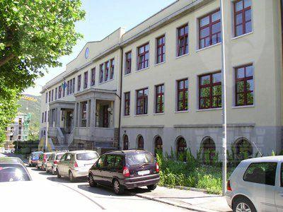 L'edificio è ubicato sulla collina di San Luigi, con l'affaccio principale su via Carlo Archi ed in prossimità di un boschetto. L'edificio, con pianta a forma rettangolare, presenta un piano interrato, due piani fuori terra ed un attico; sul fronte principale è posta una scalinata a doppia rampa. La struttura portante è in calcestruzzo armato e laterizio; i solai sono in latero-cemento. La copertura è a terrazzo con rivestimento in guaina bituminosa. Grondaie e pluviali sono in rame. L'edificio presenta lungo il perimetro una fascia di basamento in pietra bugnata; al di sopra e fino all'altezza del primo solaio si estende un rivestimento in pietra artificiale. I livelli superiori sono rivestiti da intonaco liscio di colore giallo. La cornice del tetto è in muratura ed è integrata al parapetto del terrazzo. Nella parte centrale della facciata, il parapetto forma un timpano nel quale è inserito il quadrante di un orologio (P1010128.jpg). I fori finestra sono ad arco a tutto sesto lungo il piano seminterrato, rettangolari ai piani superiori. L'atrio d'ingresso, preceduto da una breve scalinata in pietra, introduce al corridoio del primo piano ed ai vani scala (P1010037.jpg). Le aule sono disposte lungo la facciata principale, i vani di servizio sul lato opposto.