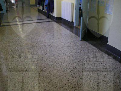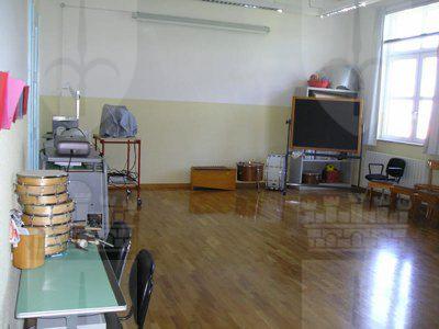 La base dei muri perimetrali è rivestita con una fascia in lastre di pietra bugnata; al di sopra e fino all'altezza del primo marcapiano, la superficie muraria è rivestita da intonaco cementizio, decorato a finto bugnato. La rimanente superficie esterna è rivestita da intonaco di colore giallo chiaro. La scalinata, collocata al centro del prospetto principale, è composta da quattro rampe di scale, a due a due simmetriche. I setti murari della scala sono rivestiti da lastre in pietra bugnata e sono forati da finestre rettangolari con infisso in alluminio ed inferriata metallica. Il pilastro in pietra inserito nel parapetto è decorato sulla parte superiore esterna con un'alabarda scolpita; nella parte retrostante è predisposto con due staffe metalliche il posizionamento di una bandiera (P1010030.JPG). Le rampe di accesso conducono ad un vestibolo, costituito da pilastri a base quadrata in calcestruzzo armato e copertura piana; la pavimentazione è in latre di pietra bianca levigata (P1010015.JPG). I fori finestra, con cornici in pietra artificiale e davanzale in pietra levigata, sono ad arco a tutto sesto lungo il piano seminterrato, rettangolari ai piani superiori. Gli infissi sono in alluminio colorato (rosso). I portoni d'ingresso sono incorniciati da piedritti ed architrave in pietra artificiale; l'infisso è in legno a due ante, dotato di portello secondario e specchiature in vetro con inferriata composta da elementi verticali. L'atrio d'ingresso conduce ad una scala con gradini in pietra; la pavimentazione dell'atrio e dell'androne è in piastrelle policrome di conglomerato levigato: la pavimentazione dei corridoi ad ogni piano è costituita da un battuto in cemento; quella delle aule e della palestra è in parquet ligneo. I locali servizio sono rivestiti con piastrelle in gres. Le rampe scala, appoggiate su profili metallici, sono in pietra; la ringhiera è in ferro saldato con corrimano in legno. Su un fianco dell'edificio, si trova il vano ascensore ed una scala di servizio in cemento armato; gli scalini sono rivestiti da lastre in pietra levigata e la ringhiera è in ferro saldato con corrimano in legno.