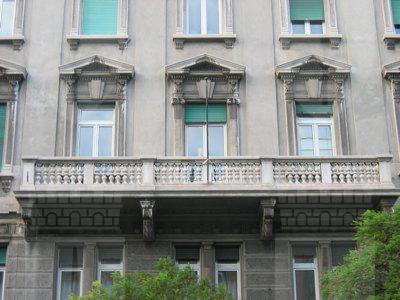 BALCONI (esterno): Balconi con balaustra in pietra in corrispondenza della sezione centrale del terzo piano, ai lati del quarto e quinto piano e a coronamento dei corpi aggettanti alle estremità della facciata principale. LESENE (esterno): Lesene di ordine gigante su alti piedistalli, scanalate nella parte superiore e arricchite da capitello corinzio in corrispondenza dei corpi aggettanti alle estremità di tutti e tre i prospetti. SEMIPILASTRI (esterno): Semipilastri con capitello corinzio in corrispondenza delle finestre tripartite poste alle estremità delle facciate e delle finestre bipartite del quinto piano. CORNICE (esterno): Cornice a dentelli lungo tutto il perimetro dell'edificio al di sopra del quinto e del sesto piano. ELEMENTI DECORATIVI (esterno): Rilievi in pietra raffiguranti motivi floreali, ghirlande, medaglioni e mensole a voluta a decorazione della superficie muraria dei tre prospetti dell'edificio. ELEMENTI DECORATIVI (interno): Decorazioni in stucco dorato, rilievi stile Liberty e affreschi caratterizzano le sale del Caffè San Marco al pianoterra dell'edificio.