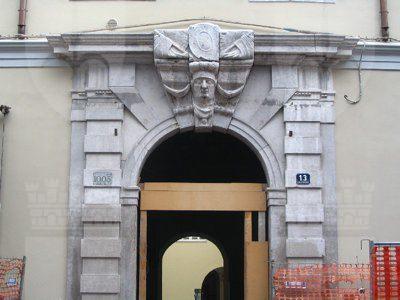 MASCHERONE (esterno) Panduro in pietra raffigurante una testa d'uomo in chiave di volta del portale. Il panduro è sormontato da uno stemma ovale e trofei militari. LAPIDE (esterno) Lapide recante l'iscrizione "Il 17 marzo 1803 nacque in questa casa Luigi de Jenner emerito ricercatore e conservatore di patrie memorie lasciò contributi preziosi alla storiografia locale". La lapide fu apposta dal Comune di Trieste il 28 marzo 1950.