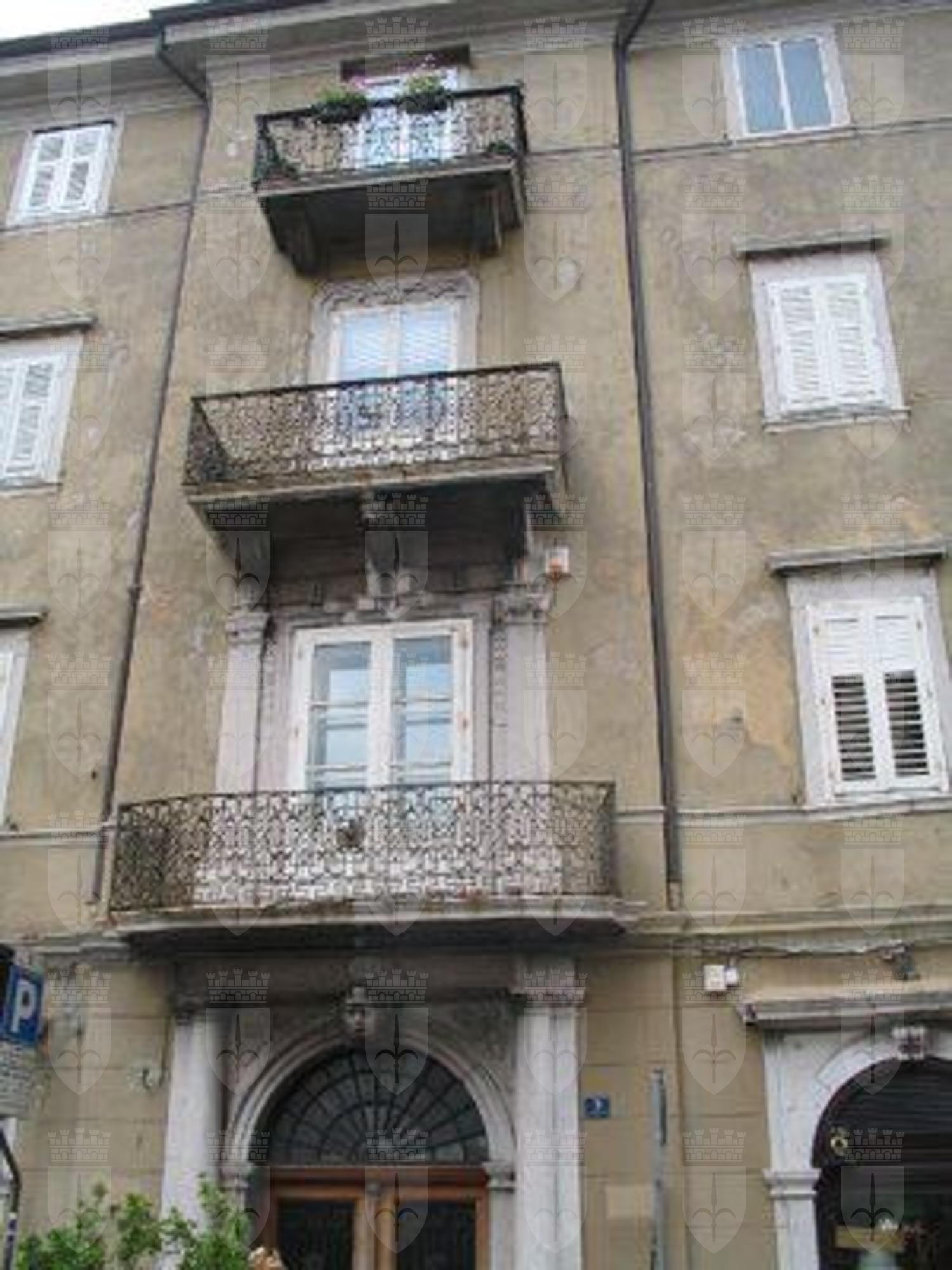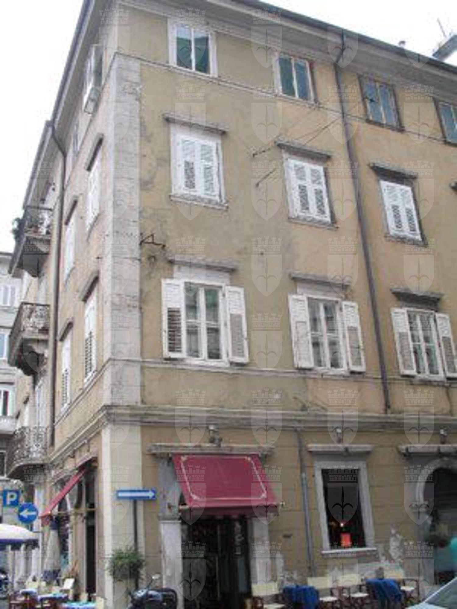 L'edificio, a pianta rettangolare, è costruito sul lotto di testa e presenta tre affacci. Si compone di pianoterra e tre piani superiori. Al pianoterra si aprono dei portali in stile cinquecentesco realizzati in pietra d'Aurisina; dello stesso materiale sono costituiti anche i riquadri delle finestre. Le finestre sono sormontate da frontone lineare. Un marcapiano sporgente delimita il pianoterra. Il prospetto principale, su via mercato Vecchio, è caratterizzato da tre balconi con ringhiera in ferro battuto al centro della facciata, in corrispondenza dell'ingresso principale. Il portale d'ingresso, inquadrato da semi colonne di ordine tuscanico, presenta un mascherone sulla chiave d'arco. Sulle specchiature ai lati della lunetta sono presenti decorazioni in rilievo.