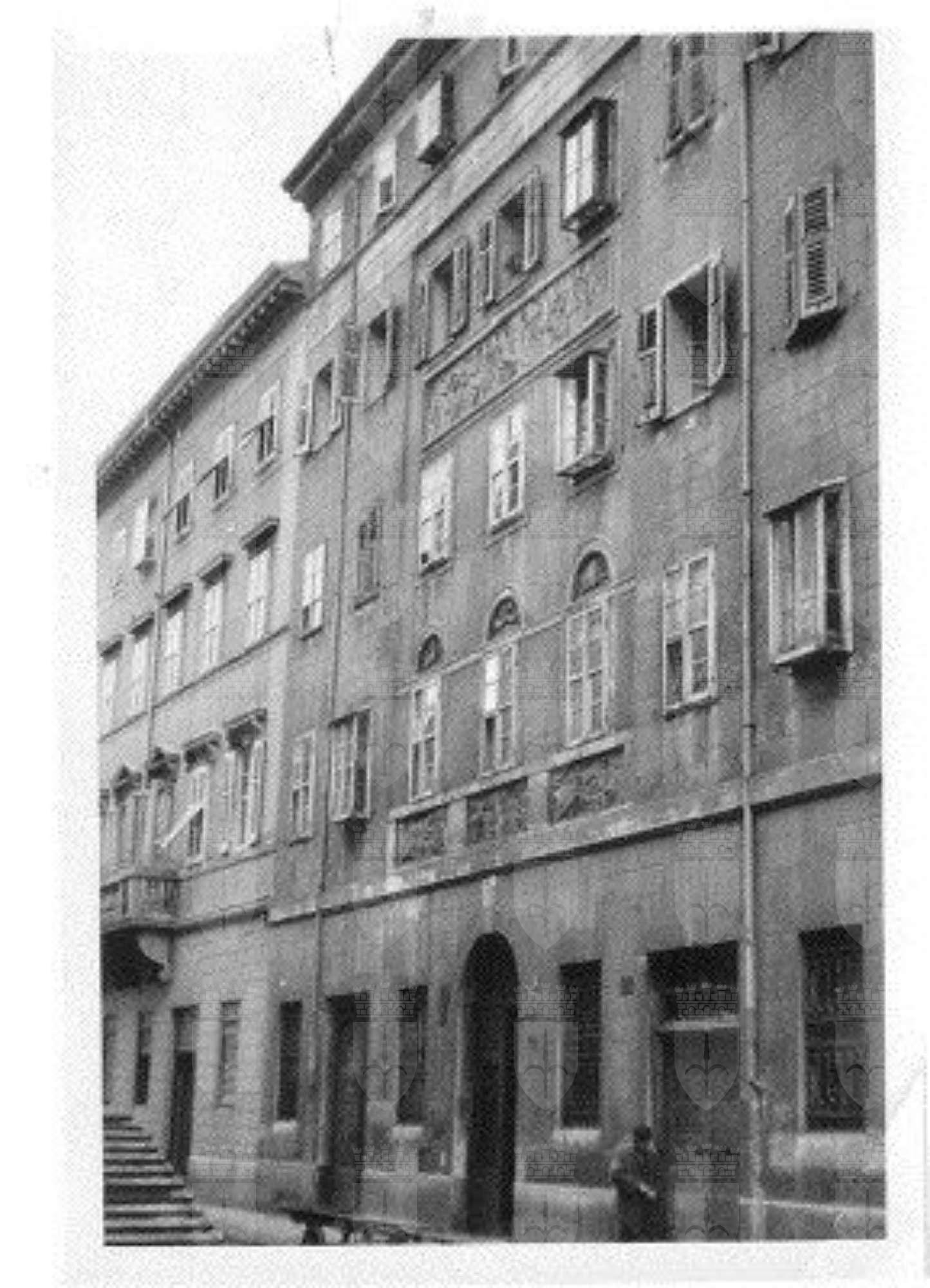 Il palazzo fa parte di un gruppo di edifici prospicienti Riva Nazario Sauro costruiti tra gli anni Venti e Trenta dell'Ottocento, nel corso di una fase di forte espansione del Borgo Giuseppino, interessato da un progetto di ampliamento delle rive. L'edificio in esame s'inserisce in tale complesso architettonico caratterizzato dall'adesione a motivi neoclassici, che determinano un "effetto di parete continua" sul mare (Firmiani, 1989). L'edificio viene realizzato tra il 1826 ed il 1827, su progetto, datato 6 luglio 1826, dell'architetto Angelo Gorian. L'immobile viene sopraelevato su disegno dello stesso architetto l'anno seguente. Alcune fonti, tra cui il Franzoni, attribuiscono la paternità del progetto a Valentino Valle. Nel 1906 il prospetto su Riva Nazario Sauro viene arricchito dal un balcone collocato al centro del primo piano.