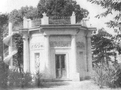 SCULTURE (esterno): Sculture raffiguranti quattro cavalli a lato della scalinata di accesso alla gloriette. SCULTURE (esterno): Sculture raffiguranti leoni, tigri, sirene e sfingi a coronamento della balaustra della gloriette. SCULTURE (esterno): Quattro sculture opera di Francesco Bonazza raffiguranti l'Abbondanza, la Pudicizia, Adone e una figura di guerriero all'interno di nicchie aperte su quattro lati dell'ottagono della gloriette. FREGIO (esterno): Fregio a rilievo raffigurante putti in diversi atteggiamenti lungo il perimetro della superificie muraria superiore della gloriette. SEMICOLONNE (esterno): Semicolonne di ordine dorico in corrispondenza degli angoli della struttura ottagonale della gloriette.