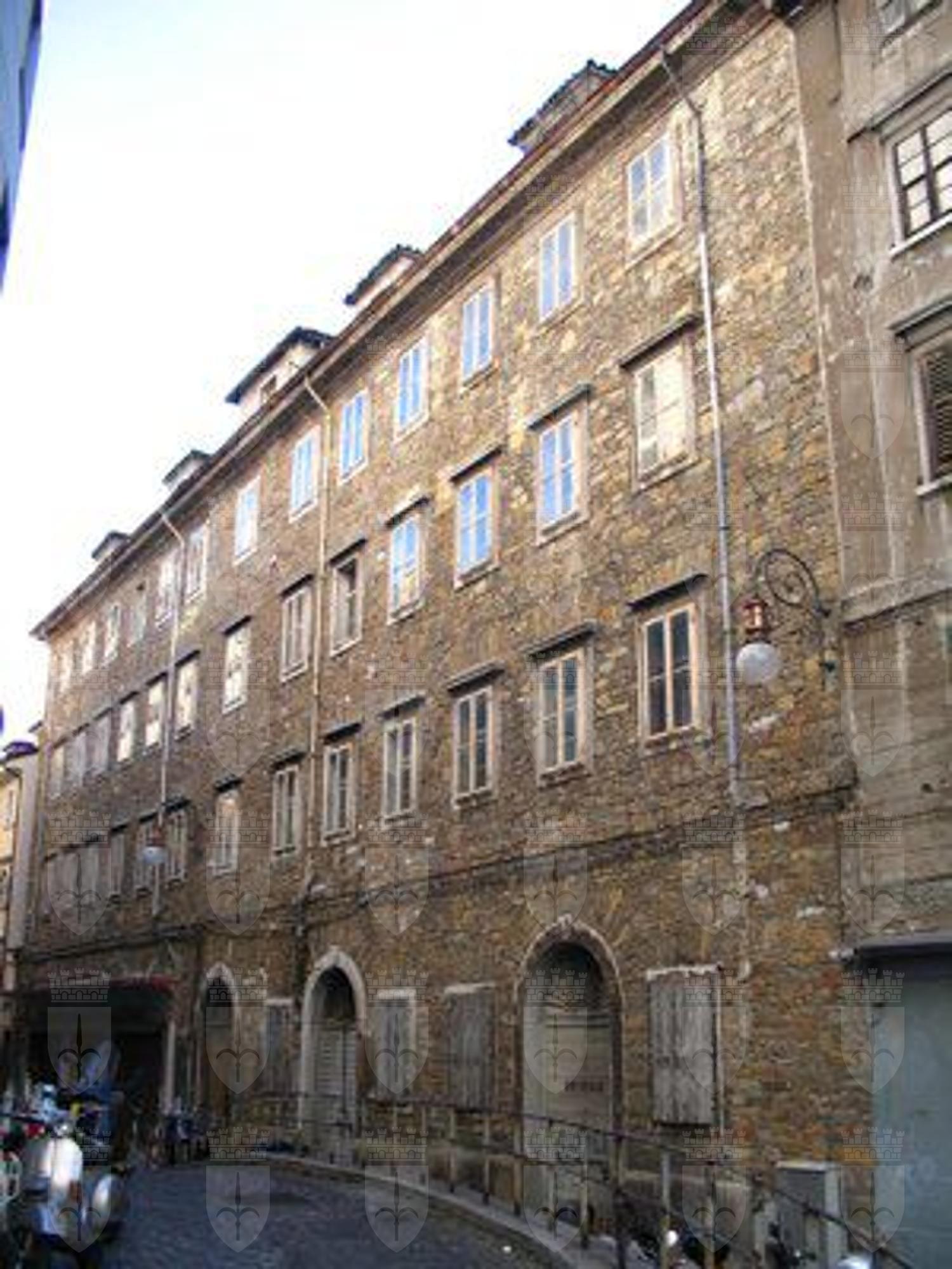CORNICE (esterno): Cornice lineare in pietra a decorazione delle finestre dei piani superiori del prospetto su Via degli artisti. CORNICE (esterno): Cornice costituita da elementi in pietra disposti a fasce che girano a raggiera sui fori del pianoterra. ABBAINI (esterno): Abbaino centrale più grande affiancato simmetricamente da quattro ulteriori abbaini a coronamento del prospetto.