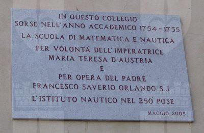 LAPIDE (esterno) Sul lato sinistro dell'edificionel maggio del 2005 è stata collocata una lapide recante la scritta " IN QUESTO COLLEGIO SORSE NELL'ANNO ACCADEMICO 1754-1755 LA SCUOLA DI MATEMATICA E NAUTICA PER VOLONTA' DELL'IMPERATRICE MARIA TERESA D'AUSTRIA E PER OPERA DEL PADRE FRANCESCO SAVERIO ORLANDO S.J. L'ISTITUTO NAUTICO NEL 250° POSE".