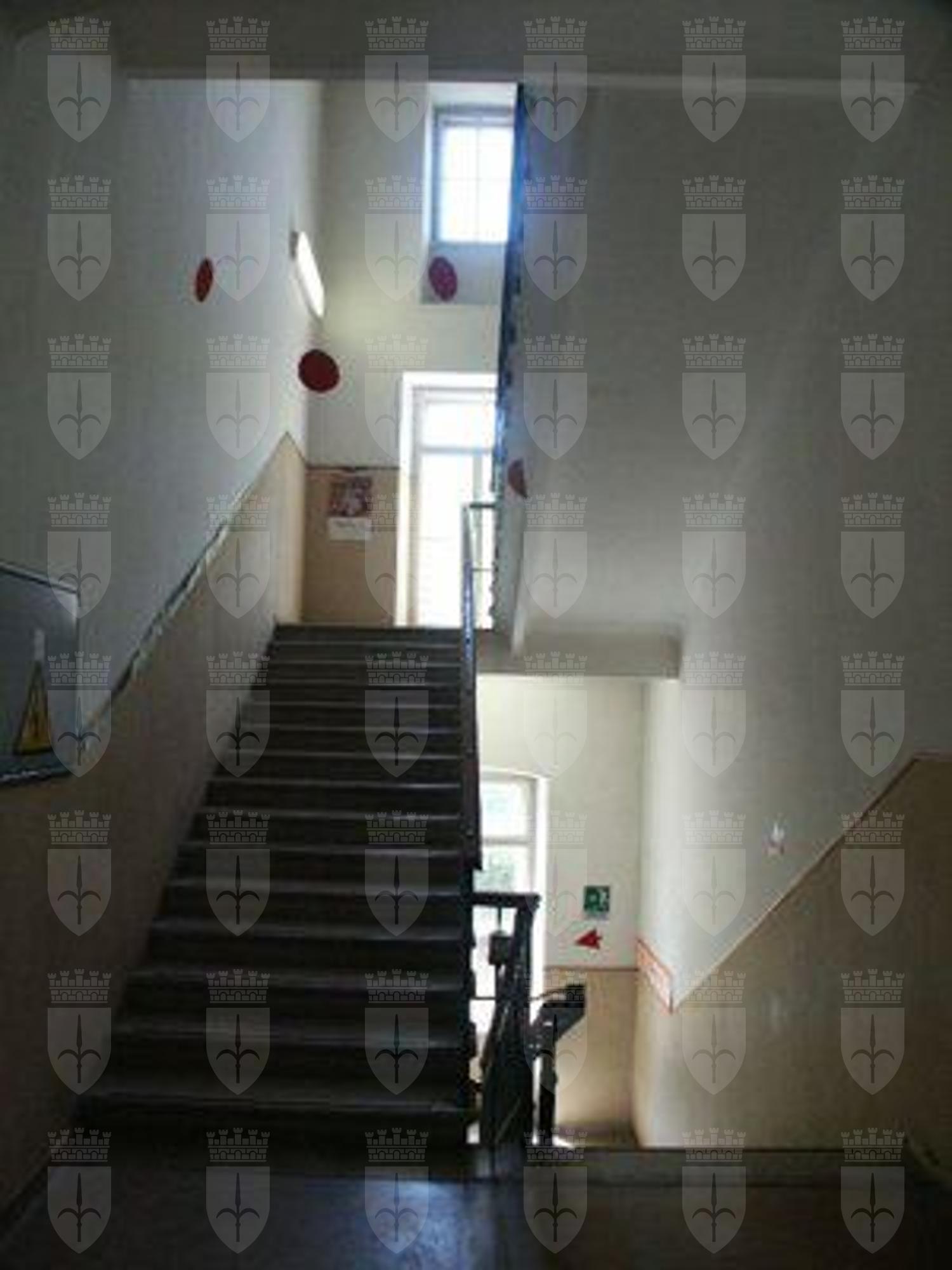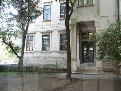 STEMMA (esterno) A decorazione di una parasta d'angolo della facciata principale, stemma alabardato su scudo tondo decorato da motivi floreali, rifinito ad intonaco. LAPIDE (esterno) Lapide marmorea posizionata sotto al portico dell'ingresso principale, riportante la dicitura "ARA DI PACE TRA LA CITTA' E IL CONTADO QVESTA SCUOLA DIFESI PER TRE LVSTRI I CONCVLCATI DIRITTI, IL 5 GENNAIO MCMXXI, GIORNO DELL'ANNESSIONE LIBERA EFFONDE IL SVO INNO ALLA GRANDEZZA D'ITALIA" ELEMENTO ORNAMENTALE (esterno) Sopra la lapide presso l'ingresso principale, tondo in pietra bianca raffigurante il profilo di Dante Alighieri. ISCRIZIONE (esterno) Un'iscrizione ad intonaco in corrispondenza della facciata ovest riporta la dicitura "SCVOLA ELEMENTARE ATTILIO GREGO" LAPIDE (interno) Nell'atrio di ingresso, alla base della scala principale, una lapide in marmo scuro riporta a lettere dorate la seguente dicitura: "ATTILIO GREGO, DAL CUI NOME HA VANTO QUESTA SCUOLA TRE FERITE E QUATTRO MEDAGLIE AL VALORE CONSACRANO ALLA STORIA DELLA NOSTRA REDENZIONE, XXIII-I-MCMXXX, TRIESTE ANNO VIII"