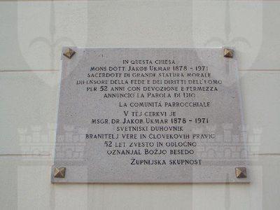 TARGA (esterno): Lastra lapidea collocata sul fronte principale, a fianco dell'ingresso, recante iscritta la dedica "IN QUESTA CHIESA/ MONS. DOTT. JAKOB UKMAR 1878 - 1971/ SACERDOTE DI GRANDE STATURA MORALE/ DIFENSORE DELLA FEDE E DEI DIRITTI DELL'UOMO/ PER 52 ANNI CON DEVOZIONE E FERMEZZA/ ANNUNCIO' LA PAROLA DI DIO/ LA COMUNITA' PARROCCHIALE". Segue la traduzione in lingua slovena. RIQUADRO (esterno): Lastra lapidea con cornice posta sopra il portone principale d'ingresso, con iscrizione latina.