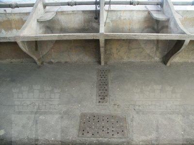La facciata prospettante la Via San Giacomo, dallo stile tardo eclettico di fine secolo XIX-inizio secolo XX, pur costituendo un semplice muro di recinzione, è trattata come un elemento architettonico separatore tra interno ed esterno. Il ritmo della composizione è scandito verticalmente da coppie di paraste trattate ad intonaco, che salgono dal basamento ad intonaco grezzo sino al coronamento modanato. Lo sporto di linda è sorretto apparentemente da finte mensole in intonaco e sottolineato dal cromatismo grigio in contrasto con il colore brillante della facciata, semplicemente intonacata liscia e dipinta in colore giallo pastello. I fori architettonici seguono il ritmo delle paraste e sono messi in evidenza da cornici intonacate grigie leggermente incassate rispetto al filo di facciata. I serramenti di accesso sono costituiti da cancellate metalliche verniciate grigie, mentre i serramenti di finestra sono costituiti da infissi lignei verniciati grigi con inferriate metalliche decorate di protezione alle ante vetrate. La struttura portante della copertura è costituita da colonnine in ghisa con capitello e giunto bullonato in corrispondenza dell'appoggio dell'architrave e da un secondo ordine di travature ortogonali a quella di bordo, sistemate in appoggio alla muratura costituente la facciata perimetrale. Il manto in lamiera convoglia con poca pendenza le acque piovane in gronde e pluviali metallici verniciati. Sotto la protezione della tettoia le attrezzature in pietra artificiale del lavatoio costituiscono due lunghe file di vasche complete di mensole per l'appoggio del sapone e delle tubature per il convogliamento dell'acqua. A terra permane l'antico sistema di caditoie per la raccolta dell'acqua rovesciata al di fuori delle vasche stesse. Sul lato est un alto muro in pietra arenaria facciavista delimita lo spazio di pertinenza del lavatoio, semplicemente pavimentato in lastre di cemento gettate in opera.