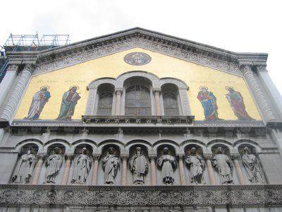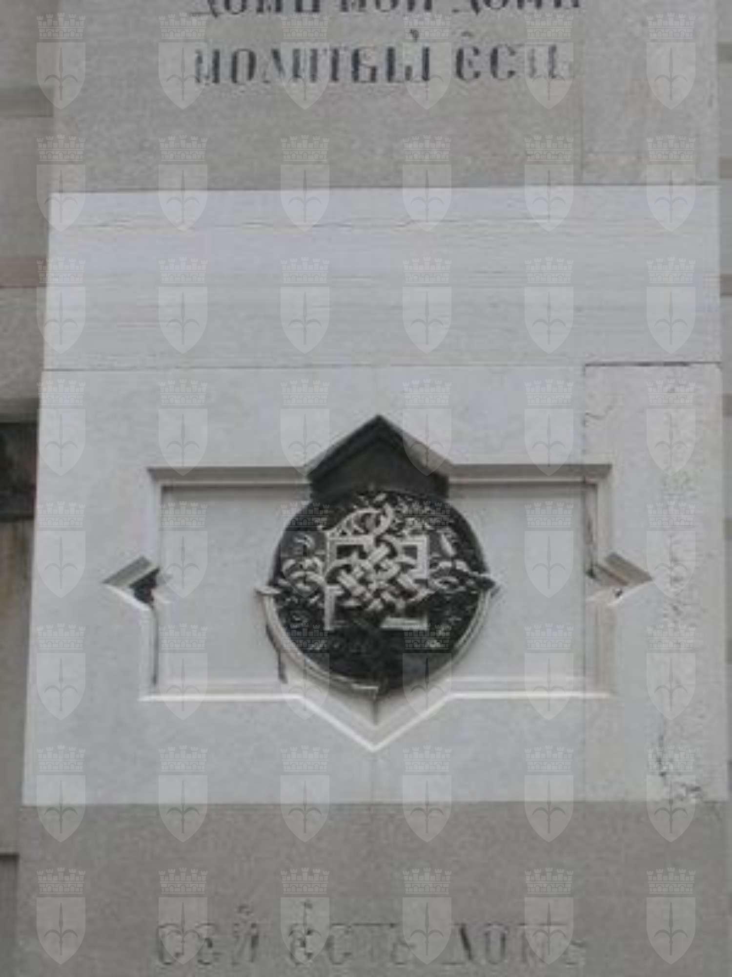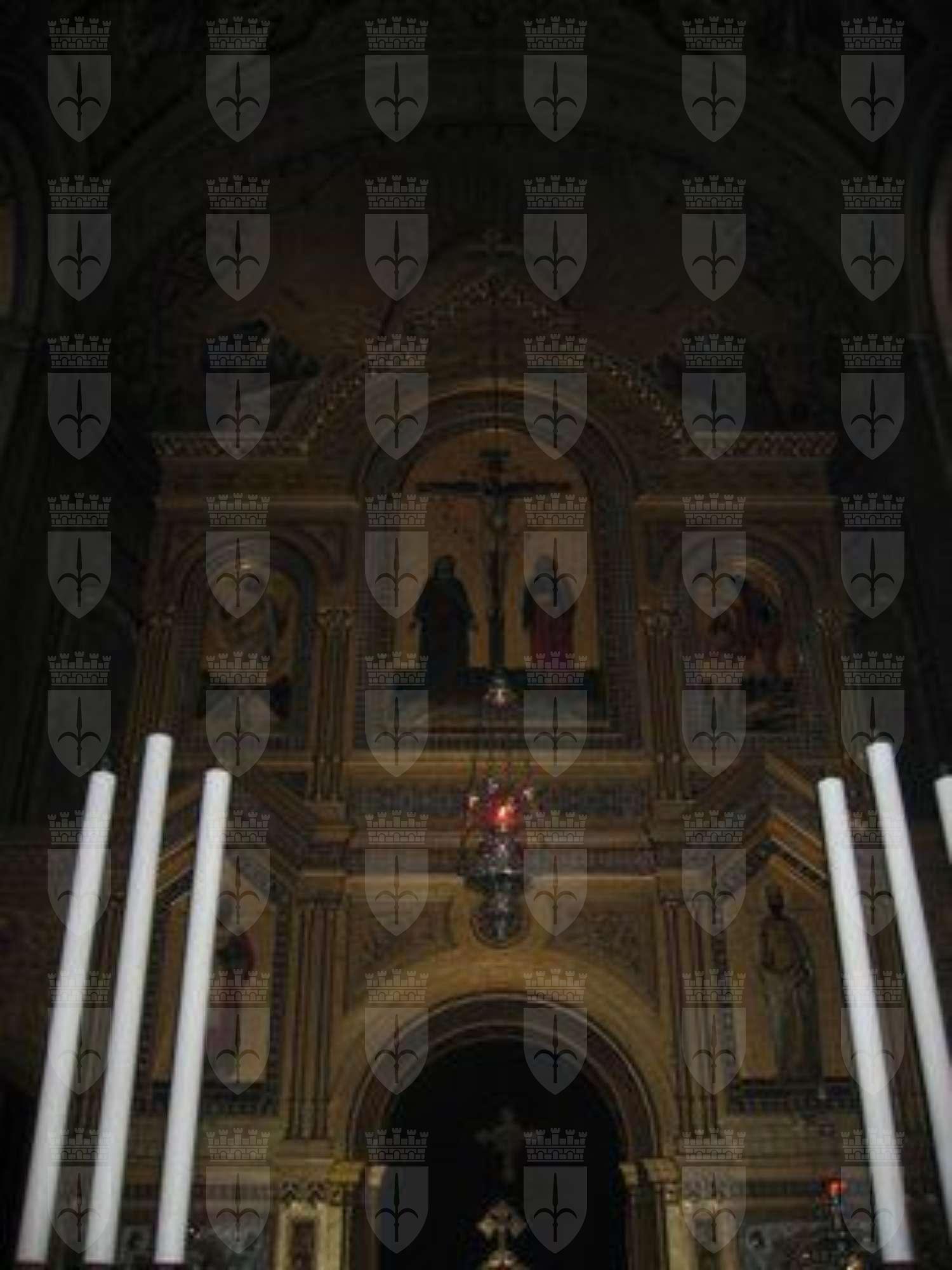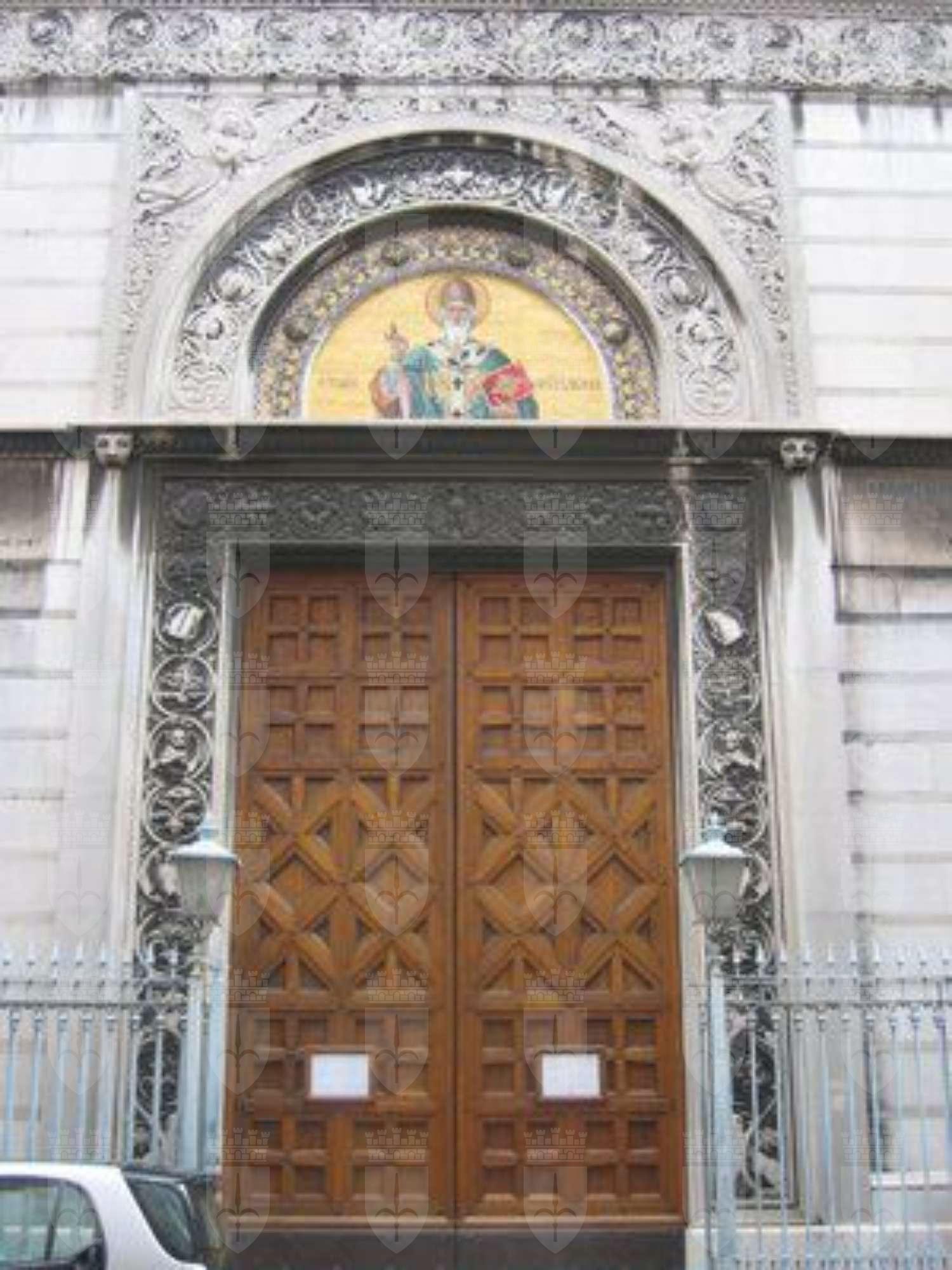 AFFRESCHI (interno): Affreschi raffiguranti "Cristo Pantocratore" con gli "Angeli reggicartigli" nella cupola centrale, nelle absidi laterali "San Spiridione al concilio di Nicea" e la "Vergine Assunta". Nella superficie superiore dell'ingresso la "Tomba di San Spiridione" e al di sopra delle porte laterali le immagini del "Profeta Elia" e il "San Giovanni Battista". I rimanenti mosaici della facciata principale rappresentano i "Quattro Evangelisti" e il "Padre Eterno". ICONOSTASI (interno): Iconostasi formata da dipinti raffiguranti la "Crocefissione" al centro ed ai lati la "Resurrezione" e il "Battesimo di Cristo". A completamento della struttura si trovano quattro icone che rappresentano "San Spiridione, la "Vergine col Bambino", "Cristo Re" e l'"Annunciazione". MOSAICI (esterno): Mosaici raffiguranti "San Spiridione" al di sopra dell'ingresso principale, "San Michele Arcangelo" e i "Santi Atanasio" e "Gregorio Nazianzeno" nelle lunette laterali. Sulla parete destra si trovano le raffigurazioni della "Madonna con Bambino" e i "Santi Basilio" e "Giovanni Crisostomo". I mosaici rimanenti rappresentano teorie di santi. SCULTURE (esterno): Statue di "Santi" a decorazione delle nicchie della facciata principale.