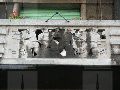 ELEMENTI ORNAMENTALI (esterno) Bassorilievi in pietra artificiale tipici di epoca fascista sono posti a decorazione dei parapetti dei balconi della facciata principale e raffigurano scene lavorative del campo delle costruzioni edili.