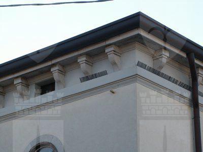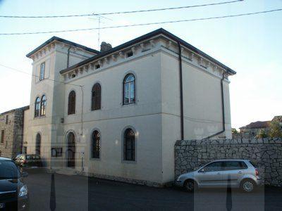 Le facciate sono trattate ad intonaco liscio color rosa sui quattro lati. Sul fronte principale un bassissimo battipiede in pietra calcarea protegge l'attacco a terra dell'edificio da danneggiamenti accidentali. Un alto marcapiano quadro di colore uguale a quello della facciata separa le finestre del piano terra da quelle del primo piano. Il coronamento è costituito da un marcapiano quadro in pietra e una serie di fitte mensole a voluta poste a sostegno della banchina e interrotte regolarmente da fori rettangolari di aerazione del sottotetto. Sul fronte principale, tutti i fori architettonici sono archivoltati, provvisti di cornice in pietra calcara, con serramenti vetrati lignei verniciati bianchi a doppia anta a quattro specchiature con sopraluce e serramenti oscuranti esterni verniciati color testa di moro. Spiccano sull'avancorpo a tre livelli una bifora al primo piano e un foro rettangolare al piano secondo, affiancato da altri due tamponati. Sul prospetto ovest i fori architettonici rettangolari con serramenti vetrati lignei doppi, a doppia anta a sei specchiature, sono protetti da oscuranti esterni verniciati color testa di moro. Grondo e pluviali sono in metallo verniciato color testa di moro e scendono esternamente lungo le facciate laterali. Il manto di copertura è in coppi curvi rossi "uso Trieste". Internamente rifinito ad intonaco con abbassamento a smalto, presenta pavimentazioni varie dal tavolato grezzo, alle marmette di cemento e graniglia, fino alla pavimentazione in pietra calcarea bocciardata.