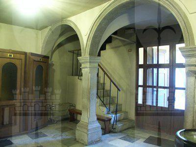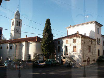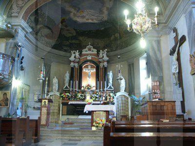 ISCRIZIONE (esterno) Sull'arco acuto dell'ingresso laterale è scolpita la data del 1584, presumibile data di edificazione della chiesa. ISCRIZIONE (esterno) Sull'architrave dell'ingresso principale si legge un'iscrizione dedicata al vescovo Rinaldo Scarlichio che consacrò nel 1628 l'edificio: "Antist(ite) et com(ite) Terg(estimo) Reinaldo Scarlichio an(n)o sal(utis) MDCXXVIII". EPIGRAFE (esterno) Su un concio a destra dell'ingresso principale si legge: "Anno D(omi)ni MDLXX/XIIII mensis Juni XIII / clavigari Marcus Boga/tac [...] Iacob Bosall [...]". AFFRESCO (interno) La volta sopra la navata, trattata a fresco da F. Ferlettig nel 1910, ospita la raffigurazione dell'Invenzione della Croce. STATUE (interno) L'altare maggiore è arricchito dalle statue marmoree raffiguranti S. Rocco, la Madonna, S. Giovanni Evangelista e S. Primo. AFFRESCO (interno) La volta dell'abside è decorata a fresco con la scena di Gesù nell'Orto. AFFRESCO (interno) Sulle pareti orientali delle cappelle laterali l'artista Antonio Jelo?in dipinse nel 1921 la scena della Liberazione di San Pietro e la raffigurazione della Sacra Famiglia. ELEMENTI ORNAMENTALI (interno) Sull'altare destro una pala decorata ad olio da una suora nel 1975 raffigura i Santi Pietro e Paolo, mentre sull'altare sinistro campeggia una statua lignea dedicata alla Madonna con Bambino. ELEMENTI ORNAMENTALI (interno) Alle pareti è raffigurata la Via Crucis in pannelli lignei a bassorilievo.
