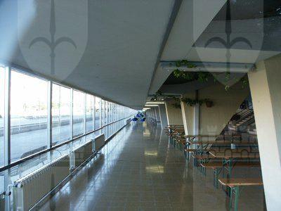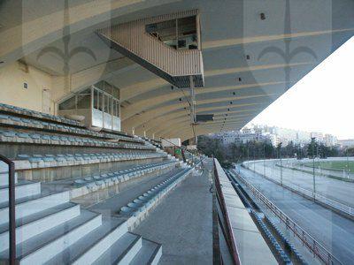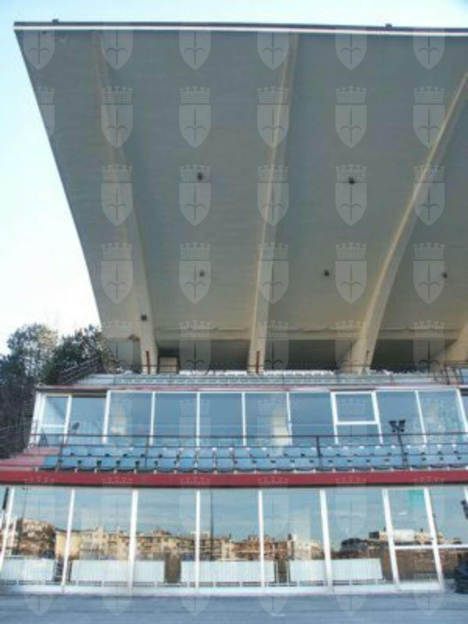 La struttura è completamente trattata in clacestruzzo armato facciavista, dipinto direttamente senza intonacatura. Le superfici vetrate completamente apribili sono in alluminio satinato. Le gradonate esterne ospitano i seggiolini conformati in plastica e le scale si distribuzione alla tribuna sono rivestite in gomma antiscivolo. I parapetti sono costituiti da semplici correnti tubolari sovrapposti verniciati in color marrone. Internamente le superfici sono per lo più spoglie e lasciano leggere pienamente la struttura, che è posta a fondamento del progetto architettonico. La pavimentazione è costituita da marmette colorate di graniglia e cemento al piano terra, da piastrelle in gres porcellanato al primo piano, mentre le scale di accesso ai piani superiori della tribuna sono rivestite in marmo travertino. L'estradosso di copertura è rivestito e impermeabilizzato completamente in guaina ardesiata; l'acqua piovana viene raccolta nella concavità della vela e convogliata a terra in pluviali posti internamente alla struttura in calcestruzzo armato.