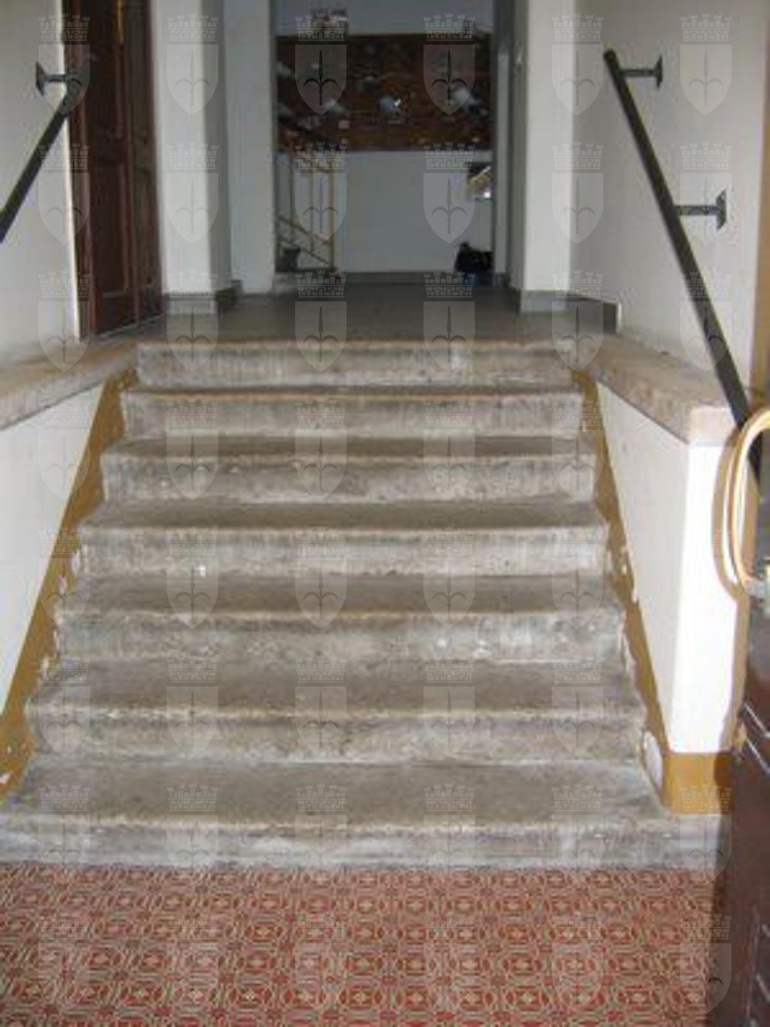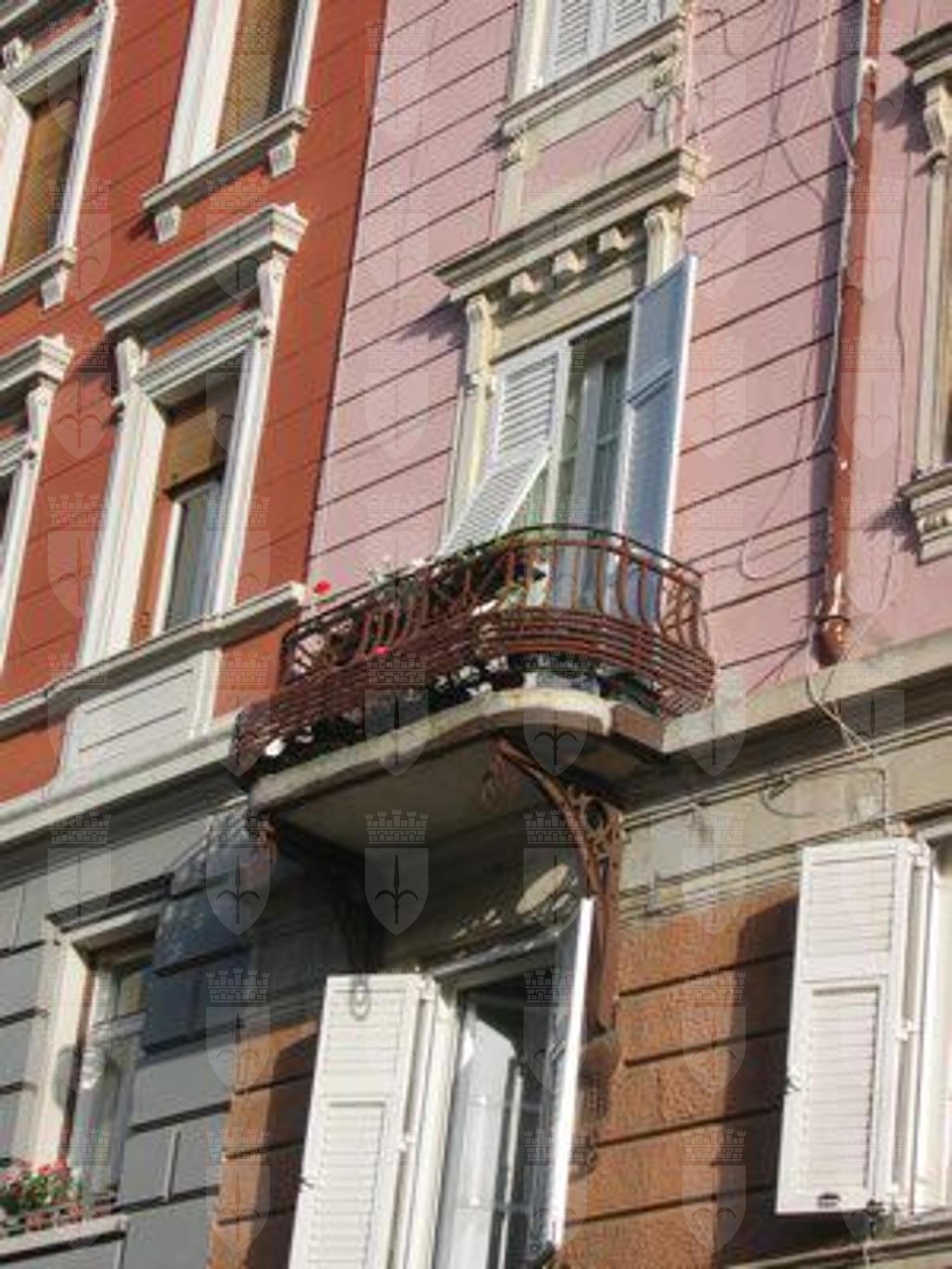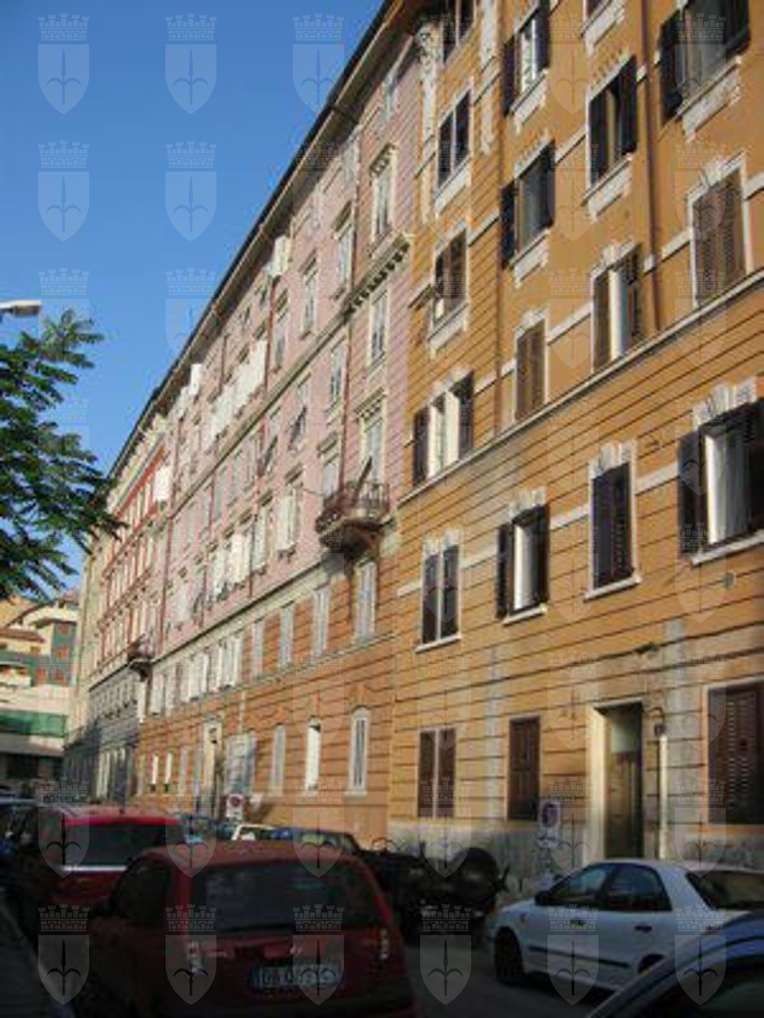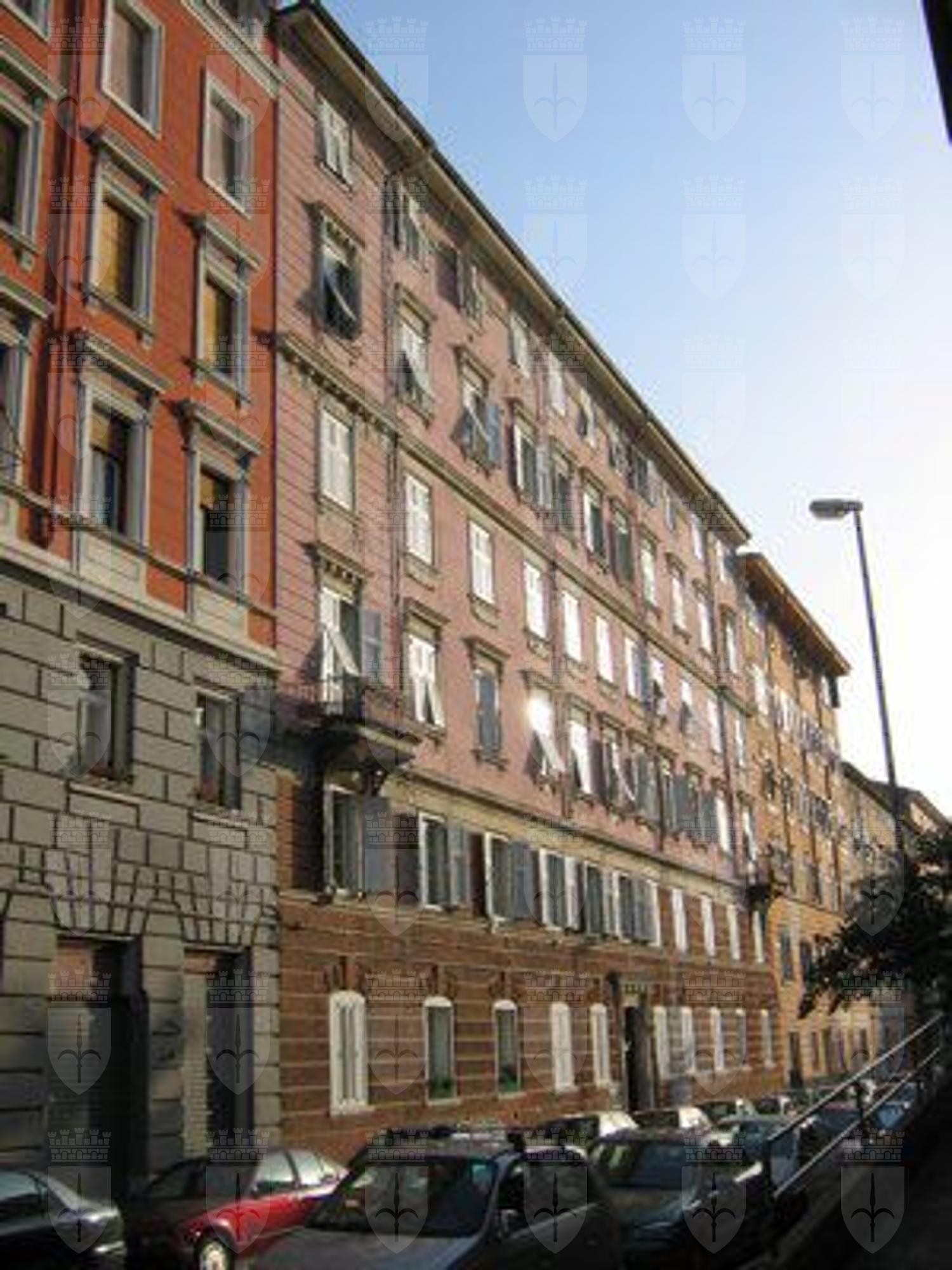 Basamento in finto bugnato rustico a fasce rifinito ad intonaco sui toni color mattone fino al marcapiano del secondo solaio ed abbassamento in lastre di pietra naturale bocciardata. Fascia superiore verticalmente tripartita in intonaco color rosa antico, lavorato liscio nella parte centrale ed a bugnato liscio a fasce ad evidenziare le estremità laterali di facciata. Alto marcapiano modanato in corrispondenza del secondo solaio; più sottile a livello del quarto solaio, aggettante e dentellato alle estremità laterali di facciata. Marcapiano a livello del solaio di sottotetto, sporto di linda intonacato. Copertura piana in guaina ardesiata. Pluviali in metallo verniciato simmetricamente distribuiti in facciata, rientranti nella muratura poco al di sopra della cornice marcapiano del secondo solaio. Fori di apertura ad arco ribassato al piano terreno per il portone d'entrata e per le finestre, rettangolari ai piani superiori per finestre e portefinestre. Archivolti delle finestre a pianterreno evidenziati da bugnato a conci con chiave di volta in rilievo e fori finestra definiti da semplice riquadro liscio e davanzale piano; riquadro liscio anche per le finestre al primo piano, con cornice modanata di collegamento sotto i davanzali delle finestre. Fori finestra dei piani superiori delineati da sottile cornice modanata. Al secondo e quarto piano, finestre riquadrate da edicole in pietra a paraste verticali, con architrave e con davanzale sostenuti da mensoline a volute, decorate da dentelli in corrispondenza dei fori in estremità di facciata; al terzo piano davanzali modanati in pietra inclusi in riquadro piano; al quinto fori finestra collegati da cornice a motivi geometrici e davanzali piani. Portone principale d'entrata inquadrato da edicola in pietra con paraste verticali ed architrave a dentelli sostenuta da mensole a voluta con peducci vegetali; analoga ma semplificata la decorazione delle portefinestre alle estremità laterali di facciata al secondo piano, con accesso a balconcini con struttura portante metallica, mensole e parapetti stile Liberty in ferro. Porta d'ingresso in legno massello a doppia anta con riquadro geometrico nella parte tamponata e specchiatura vetrata protetta da inferriata Liberty con motivi "a colpo di frusta"; sopraluce vetrato ad una specchiatura. Serramenti vetrati a due ante in alluminio verniciato bianco completi di scuri anch'essi in alluminio bianco, montati su controcassa esterna. Disimpegno dell'atrio d'ingresso in piastrelle a motivi geometrici chiari su fondo mattone, presumibilmente originali; breve rampa di accesso in pietra grigia d'Aurisina bocciardata con corrimano metallico non originale. Scala di accesso ai piani a due rampe con gradini in pietra d'Aurisina bocciardata, con corrimano in legno e ringhiera originale a geometrie Liberty in ferro verniciato ocra. Nel disimpegno e nel vano scala principale, murature in intonaco bianco liscio con fascia battipiede rifinita ad intonaco ocra; nei ripiani di scala pavimentazione originale in battuto di graniglia grigio con fascia perimetrale rossa. Nelle rimanenti parti comuni, pavimentazione originale interamente sostituita da piastrelle grigio chiaro, battipiede piastrellato e superfici trattate a solo intonaco bianco. Serramenti interni d'accesso agli appartamenti di varia tipologia, alcuni originali in legno massello. Botola originale di accesso alla copertura in legno verniciato bianco. Dispositivi di illuminazione non originali; impiantistica a vista. Cortile interno con breve rampa d'accesso in cemento e ringhiera metallica originale; superfici delle murature in intonaco bianco liscio. Fori architettonici con sola protezione metallica dalle intemperie e serramenti in alluminio verniciato bianco a due ante, completi di scuri a pianterreno; impiantistica a vista. Pluviali in pvc, grondaie metalliche.