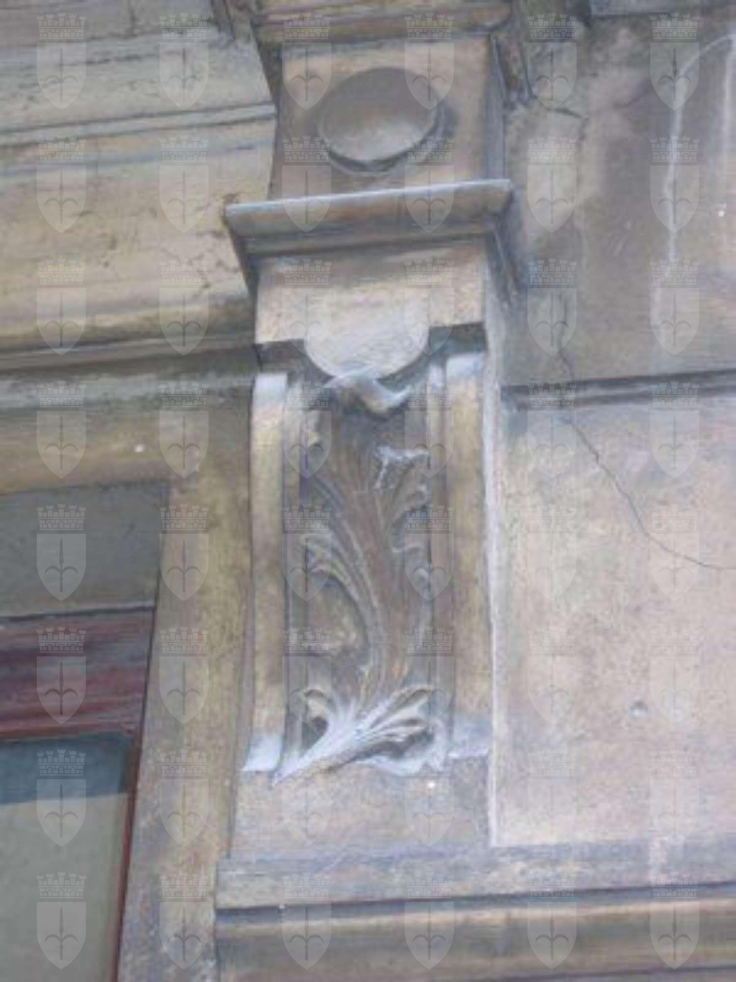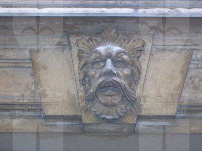 ELEMENTI ORNAMENTALI (esterno): Mascherone in pietra raffigurante forse testa di divinità marina (Nettuno) posto sul concio di chiave del portone principale (Donatello_5010.jpg) ELEMENTI ORNAMENTALI (esterno): Fascia affrescata raffigurante figure marine mitologiche (Tritoni) lungo il marcapiano del secondo solaio (Donatello_5016.jpg)