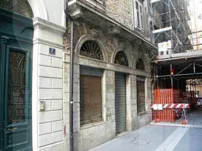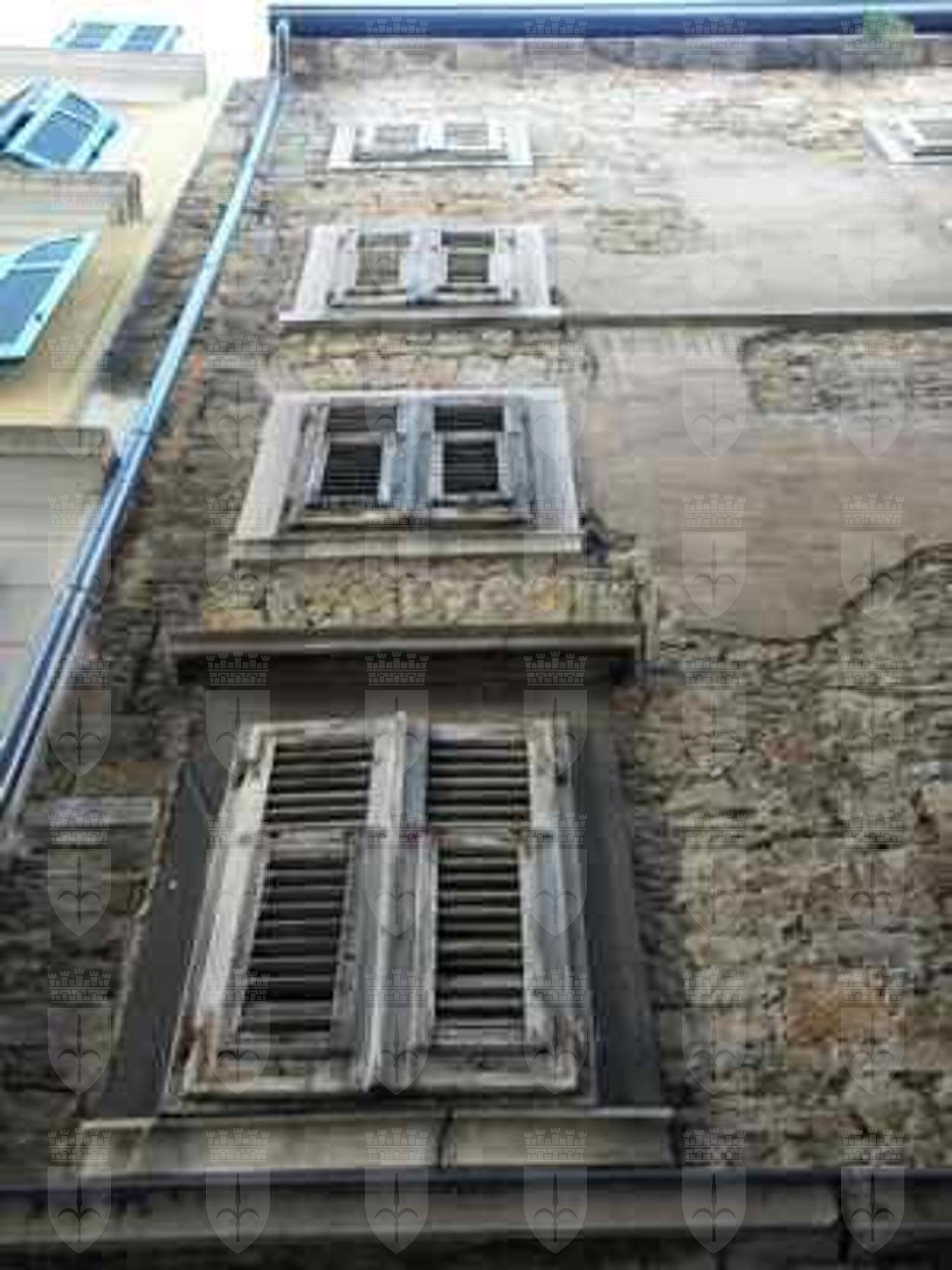 FACCIATA SU VIA BECCHERIE Basamento in pietra bianca bocciardata, rivestimento della fascia al piano terra in pietra bianca bulinata in corrispondenza del locale commerciale. Fori al piano terra con cornici arcuate in pietra bianca bulinata, decorate da chiavi di volta con volute in pietra. Architrave orizzontale sviluppato su tutta la lunghezza di facciata. Al centro un'iscrizione parzialmente leggibile (forse "MACELLERIA"). Sopraluce protetti da inferriate in ferro battuto. In corrispondenza del sopraluce del foro centrale, una lanternina in ferro battuto ed un'iscrizione recante la data 1851 (Pict0001.jpg). Banchina su mensole squadrate in pietra bianca a livello del primo orizzontamento, a protezione dell'ingresso al locale commerciale. Superficie di facciata trattata ad intonaco con marcapiano intonacato in corrispondenza del solaio del terzo piano. Serramenti oscuranti esterni in legno uso Trieste, montati su cornici in pietra bianca bulinata, con architrave a mensola al primo piano, architrave semplice ai piani superiori. Gronda e pluviale in lamiera. FACCIATA SU ANDRONA DEL PANE: Facciata trattata ad intonaco su tutta l'altezza. Fori architettonici con cornici semplici in pietra bianca bulinata. Porta di ingresso al piano terra in legno massello verniciato. Serramenti esterni dei piani superiori in legno senza oscuranti, ad otto specchiature con apertura a ghigliottina. INTERNO Scala con pianerottoli e gradini in lastre di pietra bianca bulinata e corrimano in ferro. Serramenti interni lignei e pavimenti in doghe di legno.